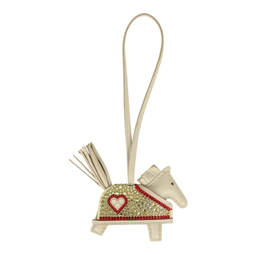 This bedazzled Rodeo Robeo Coeur Charm PM is in Craie, Jaune Milton, and Rouge Radieux Milo lambskin leather with tonal stitching, and is accented with matching mane, tail, eyes, loop, and heart and blanket detail.The bag charm is beaded in...