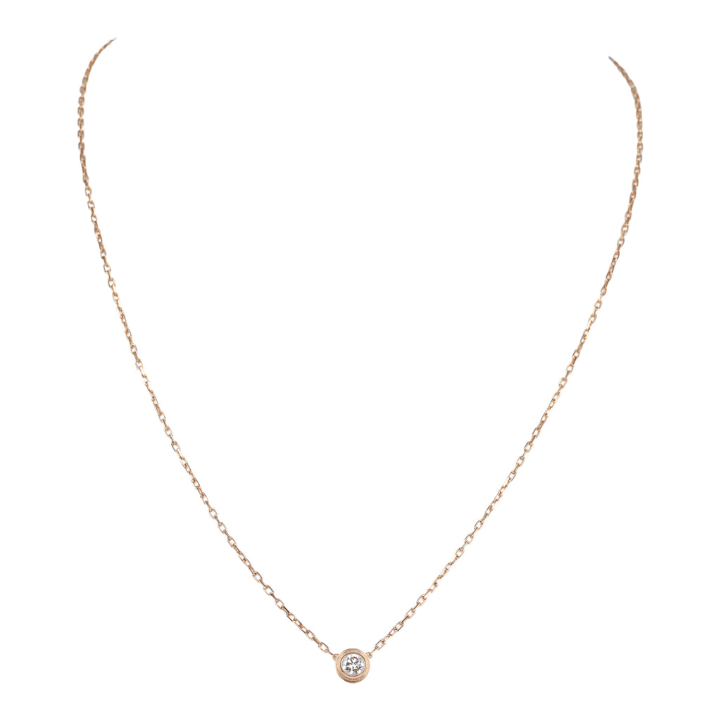This Cartier D'Amour Pendant Necklace is in 18K rose gold with a large diamond pendant totaling 0.18 carats and a lobster claw clasp.