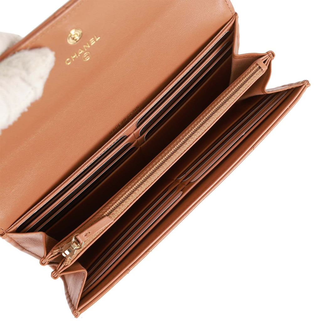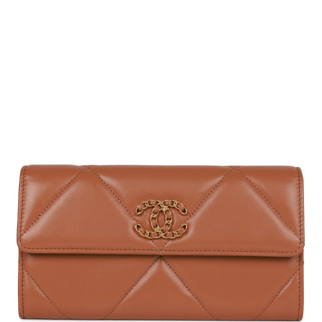 This Chanel 19 Large Flap Wallet is of Brown lambskin with gold hardware and features a Classic CC logo, signature diamond quilting and front flap snap closure.