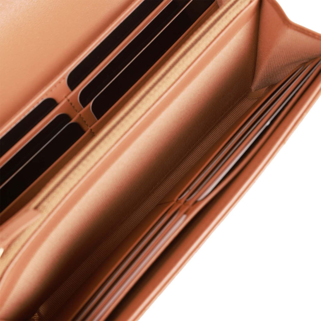 The interior is lined in brown fabric and features 6 interior front facing card pockets, 6 back card holder pockets, zip pocket coin wallet