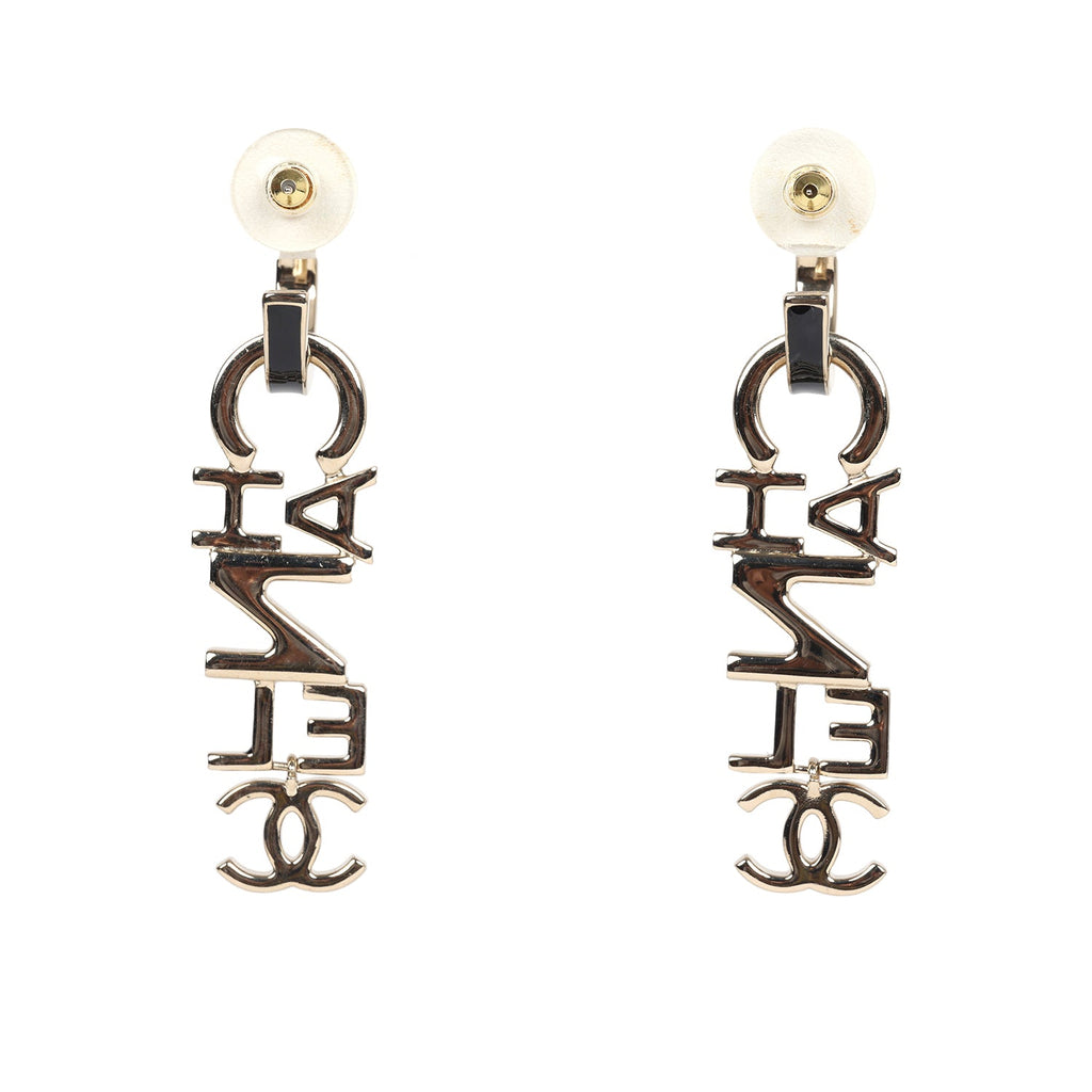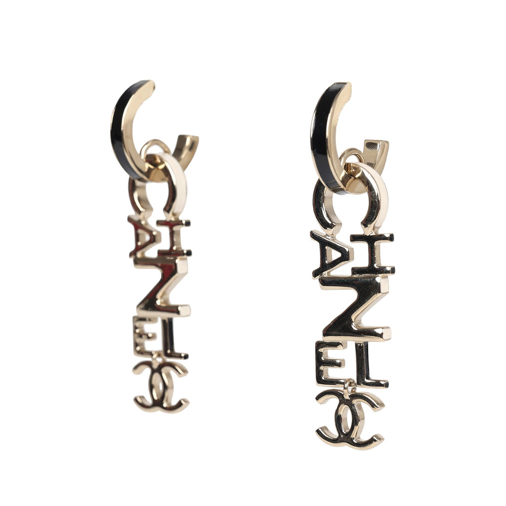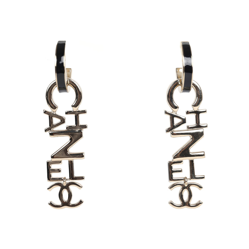 Chanel "Chanel" Letter Drop Earrings Black/White Enamel Light Gold Hardware