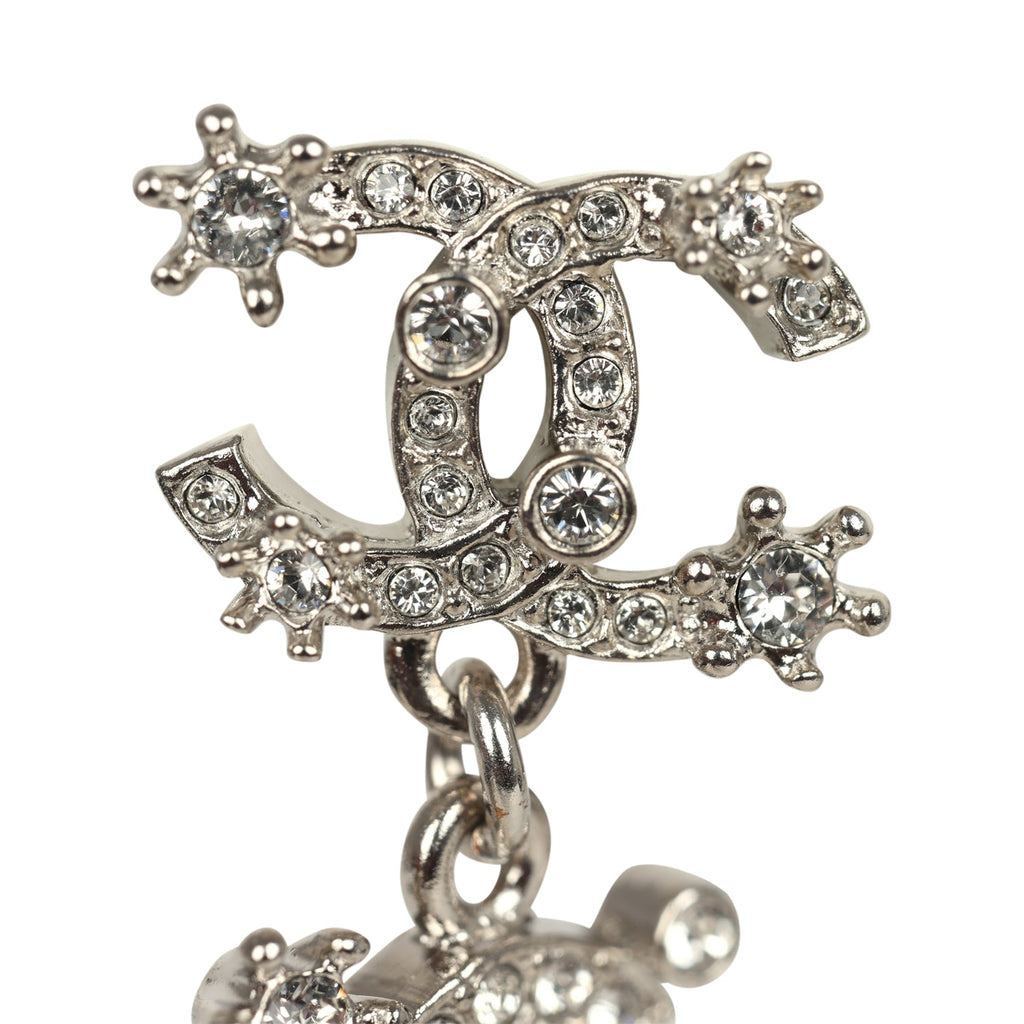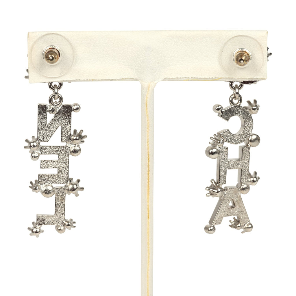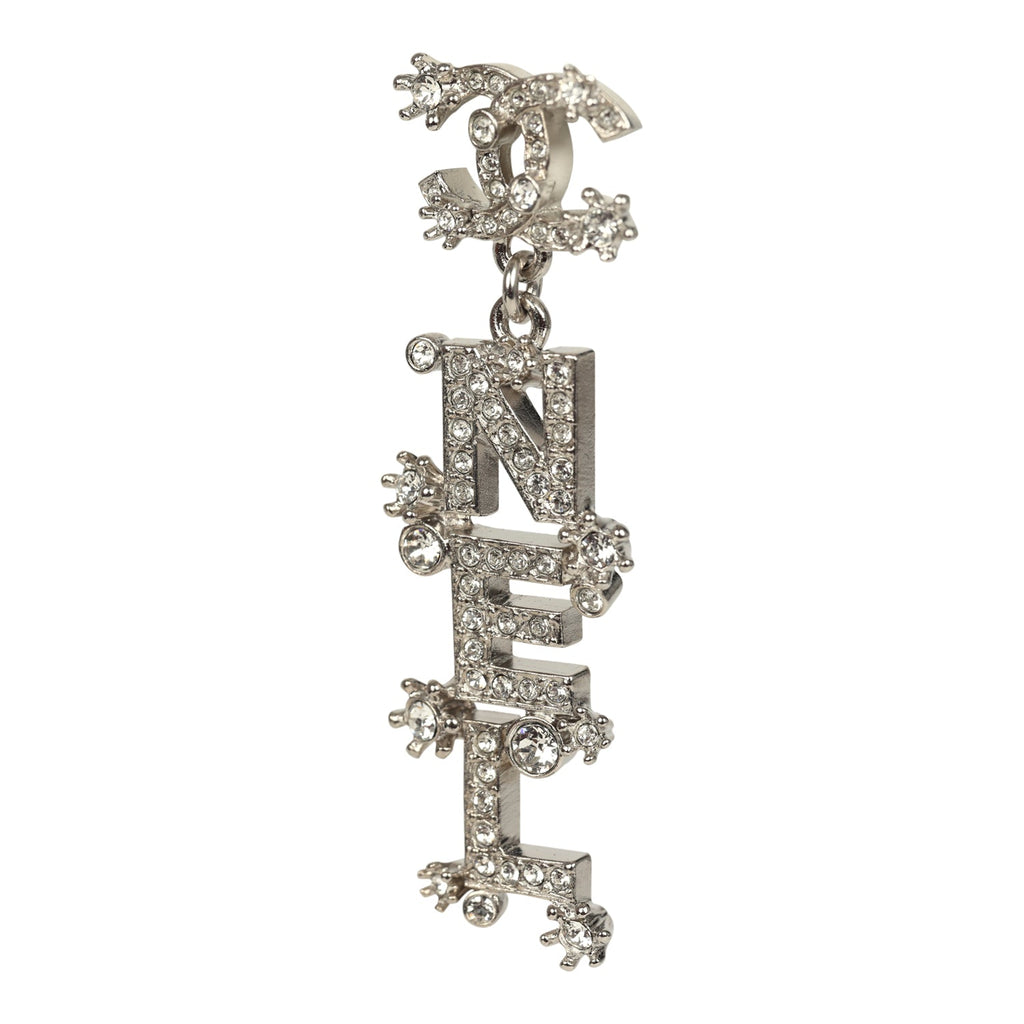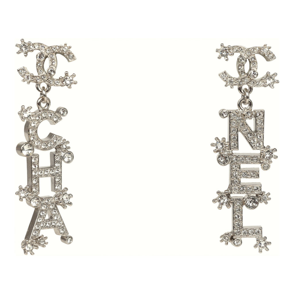 Chanel Crystal "CHA-NEL" Letter Drop Earrings Silver Tone Hardware