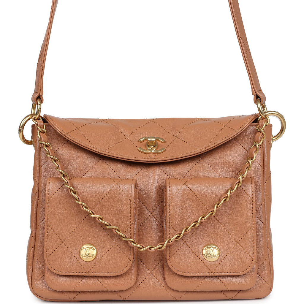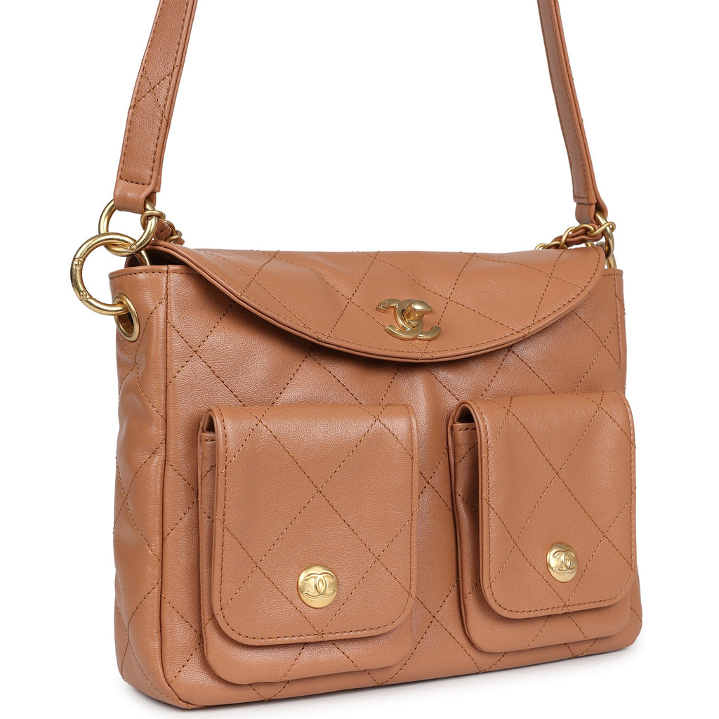 Chanel Double Pocket Hobo Bag Caramel Shiny Calfskin Brushed Gold Hardware