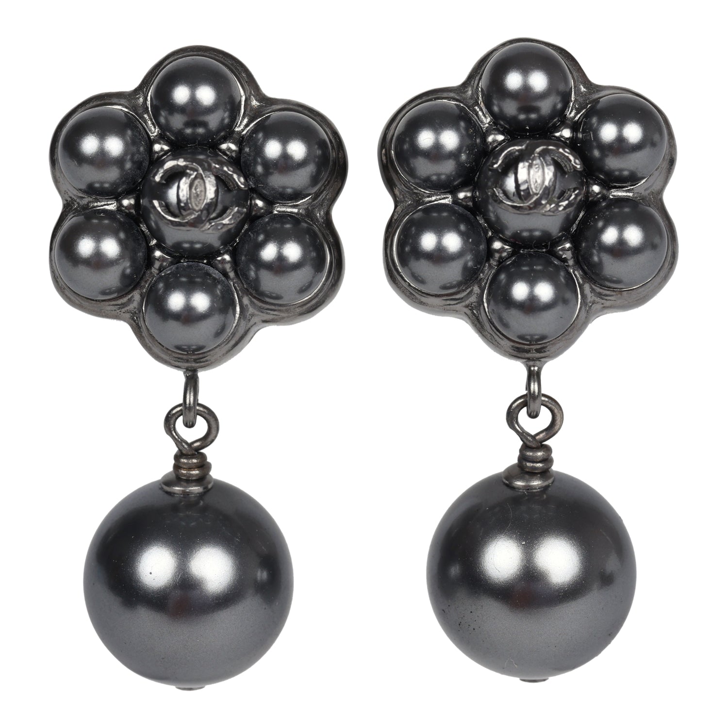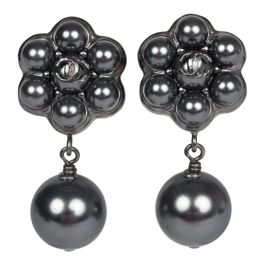 Chanel Flower Pearl Cluster Dangle Earrings Dark Grey Ruthenium Hardware