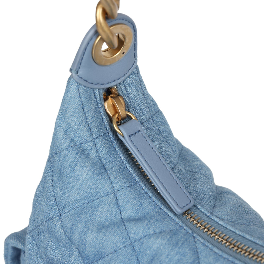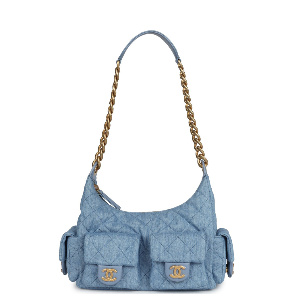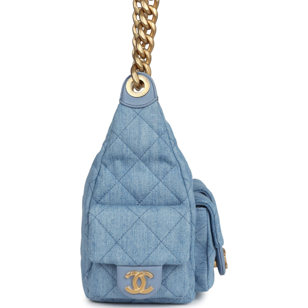 Chanel Large Cargo Hobo Bag Light Blue Washed Denim Brushed Gold Hardware