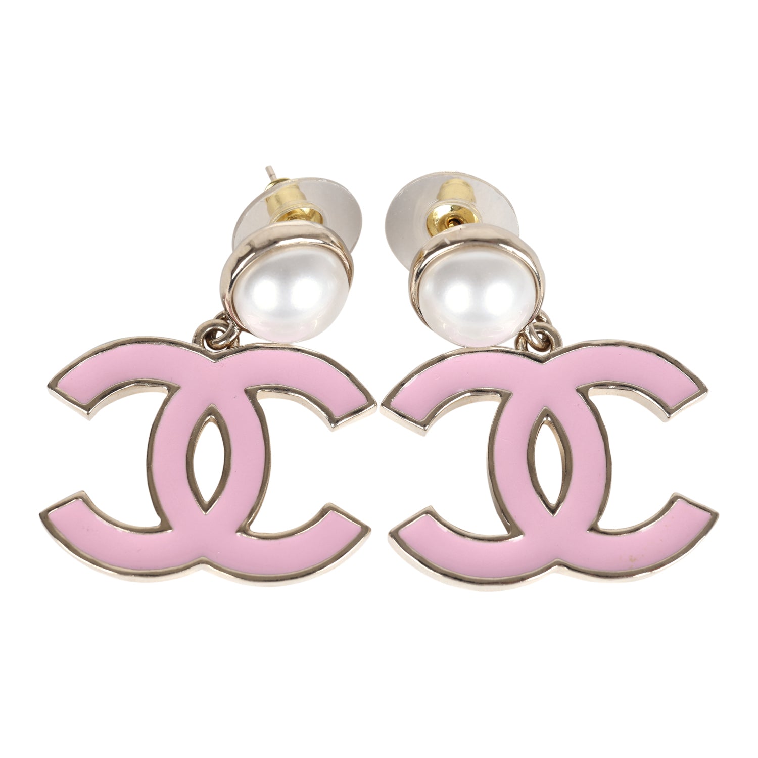 Chanel Large Enamel CC Dangle Earrings Light Pink Faux Pearl/Light Gold Tone Hardware