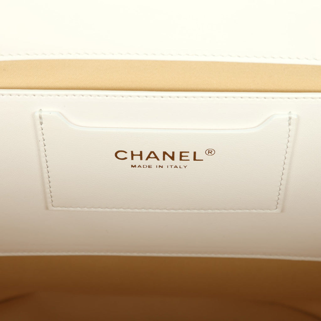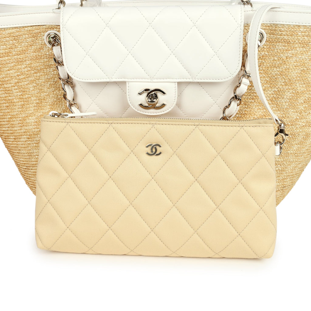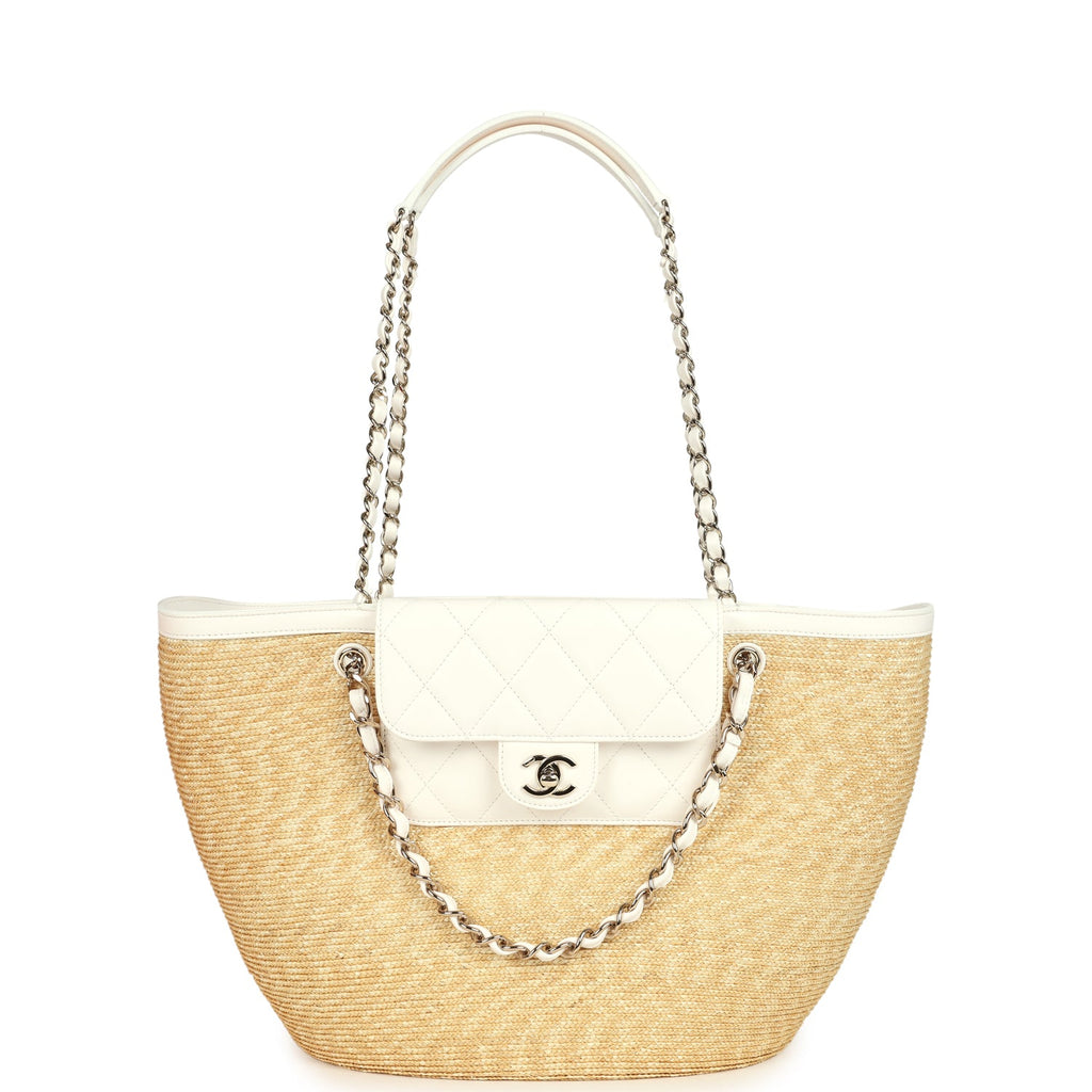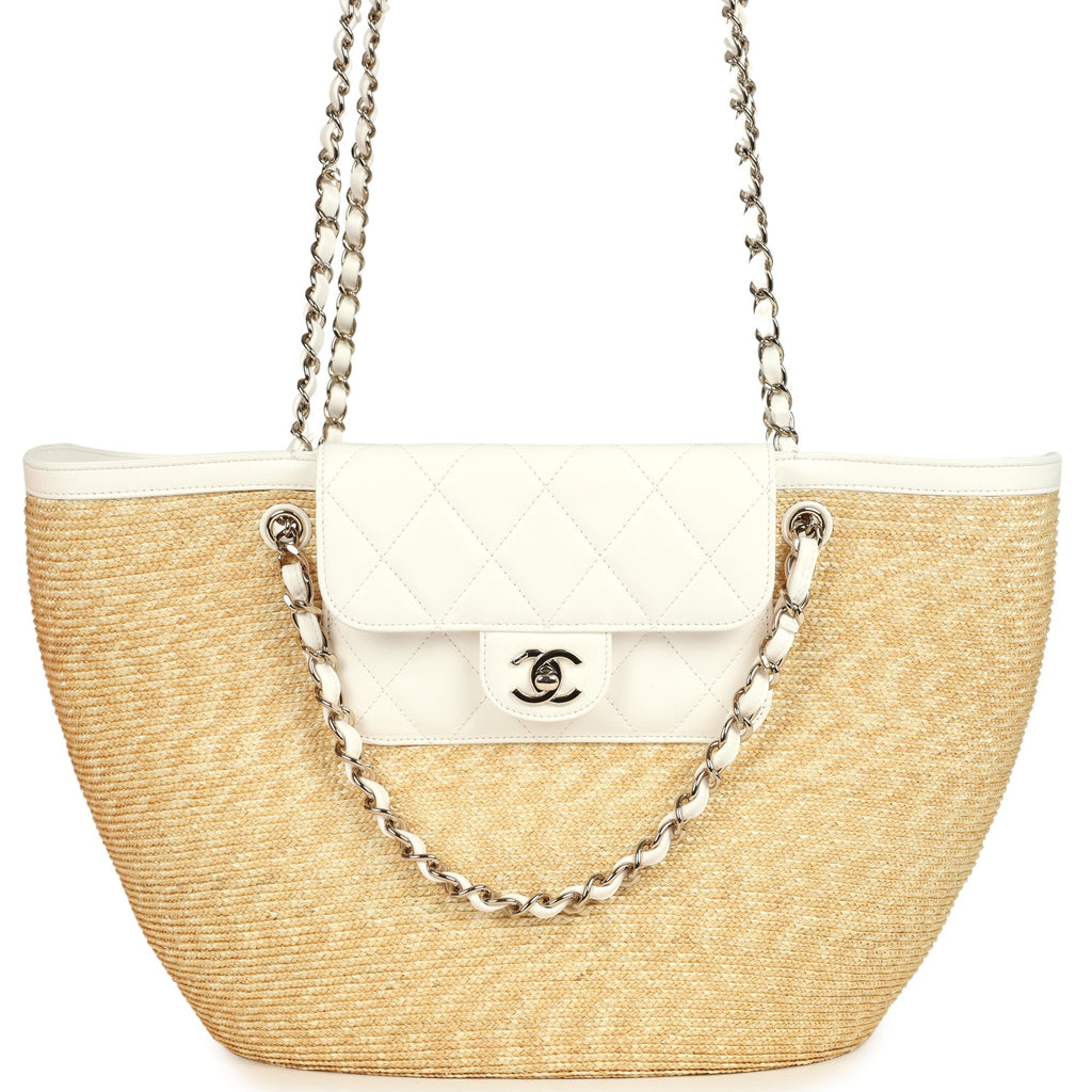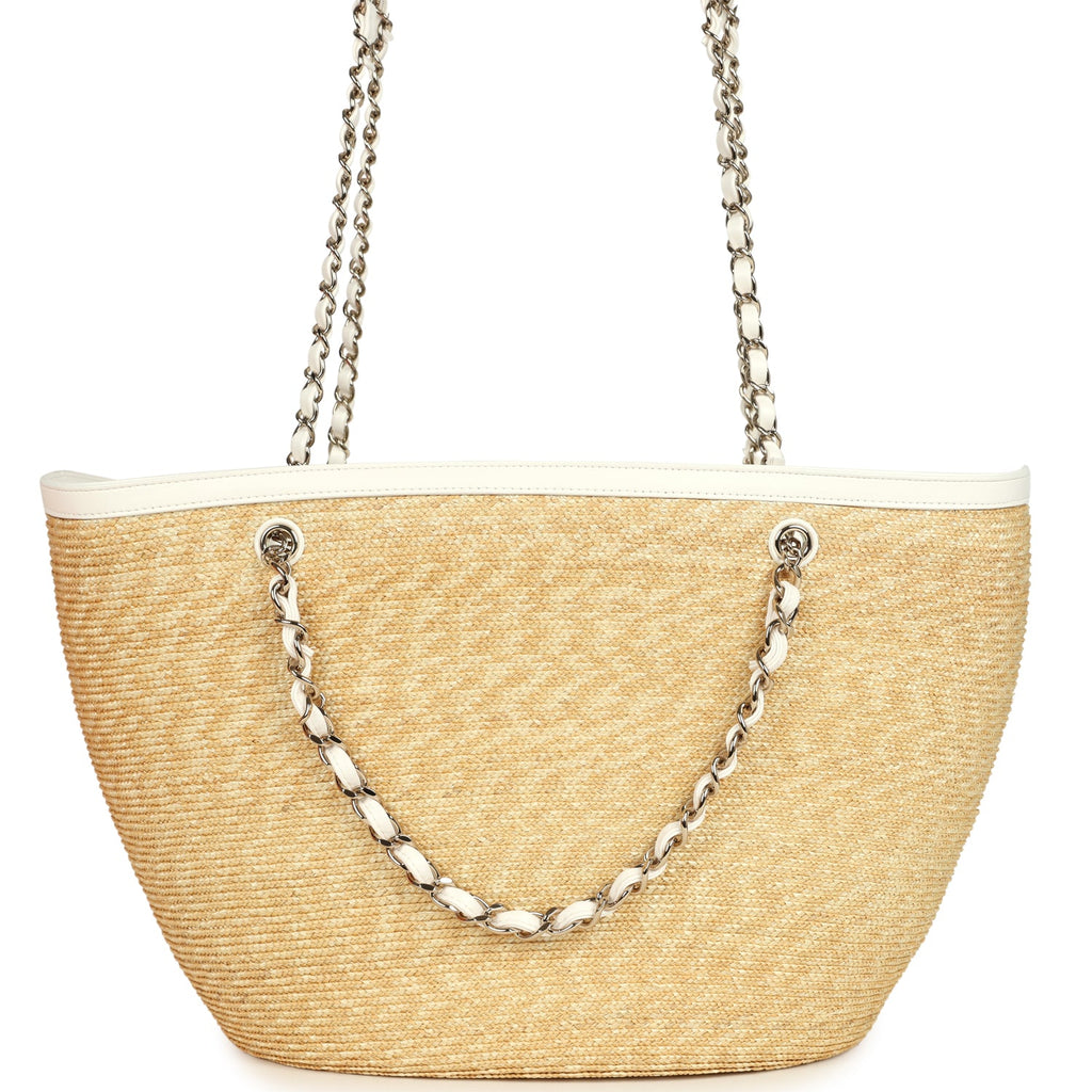 Chanel Large Shopping Tote Bag Beige Raffia and White Lambskin Light Gold Hardware