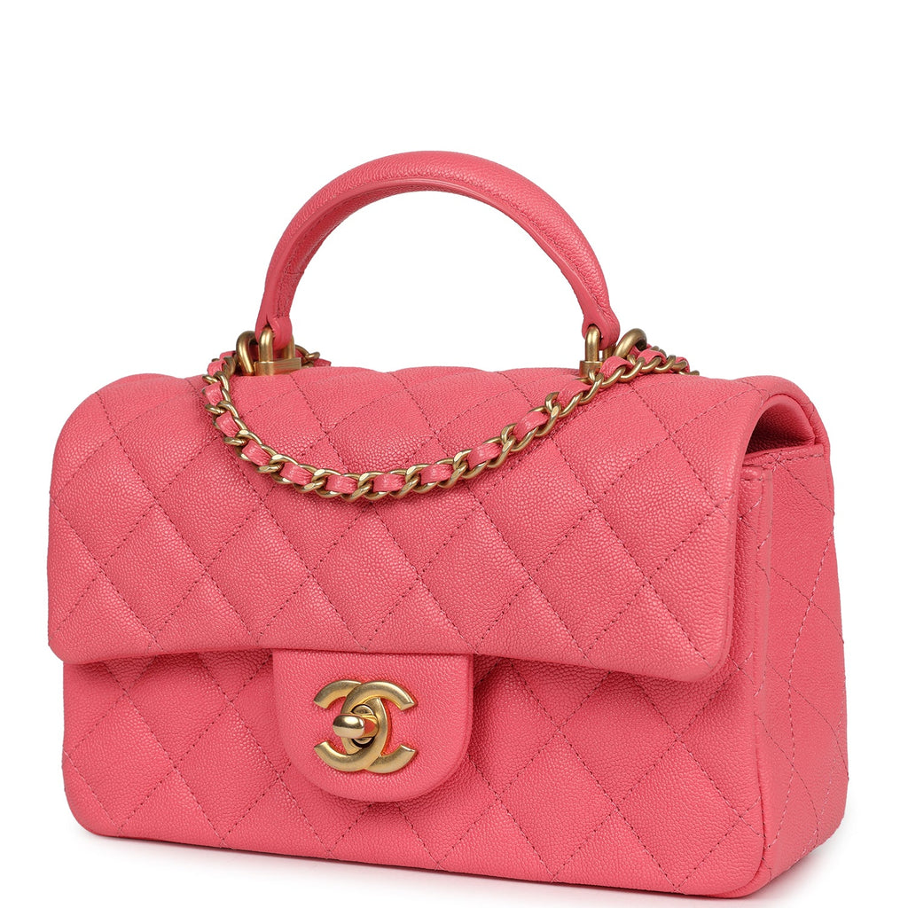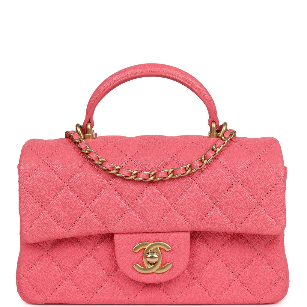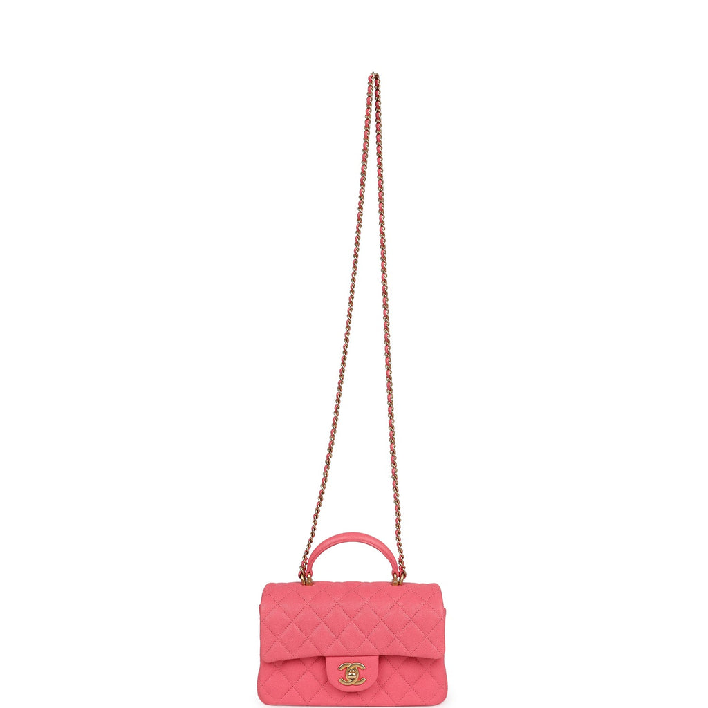 Pre-owned Chanel Mini Rectangular Flap with Top Handle Hot Pink Caviar Antique Gold Hardware