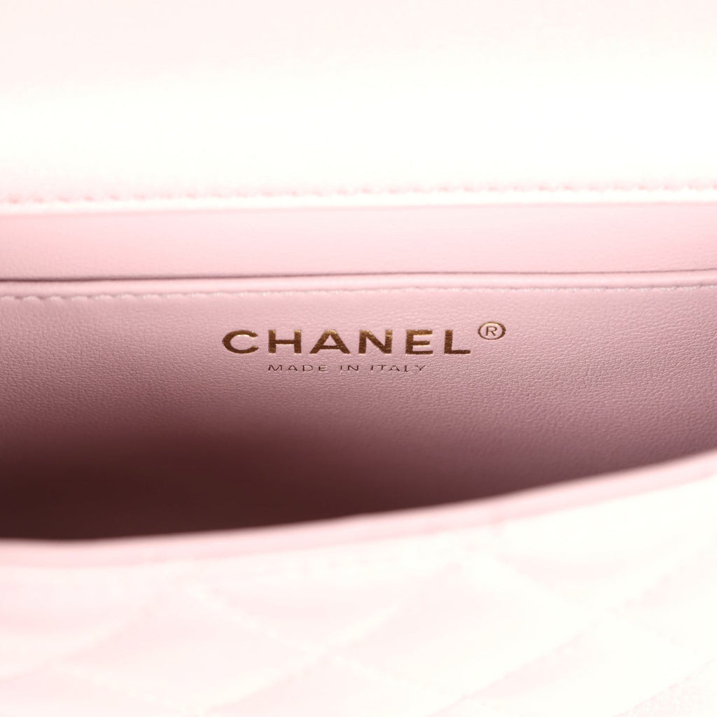 Chanel Mini Square Pearl Flap Bag Light Pink Iridescent Lambskin Brushed Gold Hardware