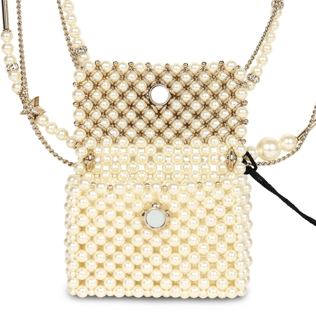 This Chanel flap bag pendant necklace is made of pearls with light gold tone hardware and features a front flap with signature CC magnetic closure, and a light gold tone chain link with pearl, CC pendants, and star pendants.