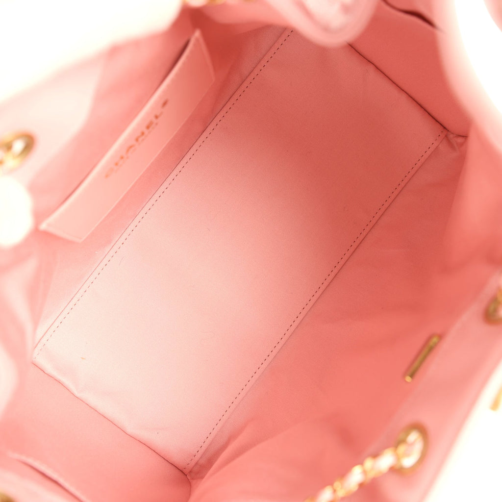 This Chanel Small 25 Hobo Bag is in light pink shiny caviar leather with antique gold hardware, features signature diamond quilt, two exterior side pockets, drawstring closure, and a single interwoven antique gold and light pink leather shoulder strap.