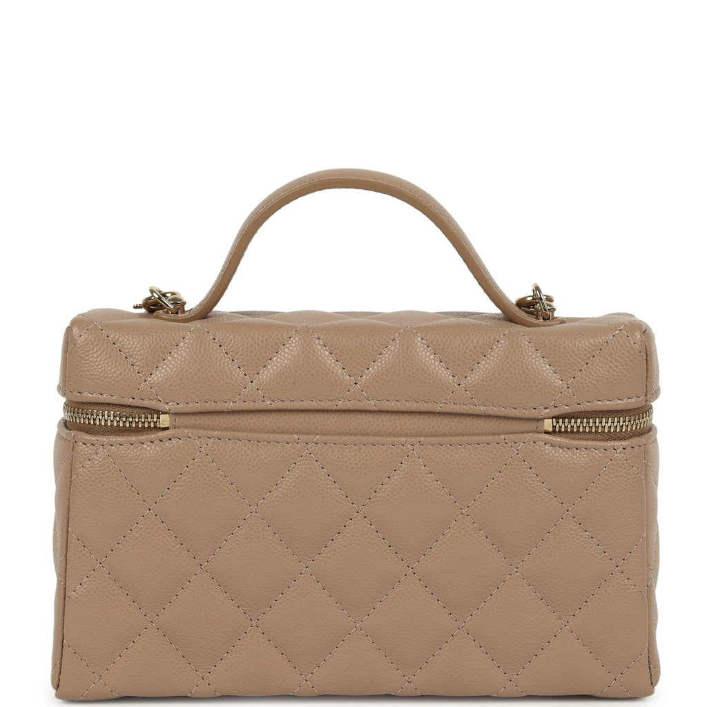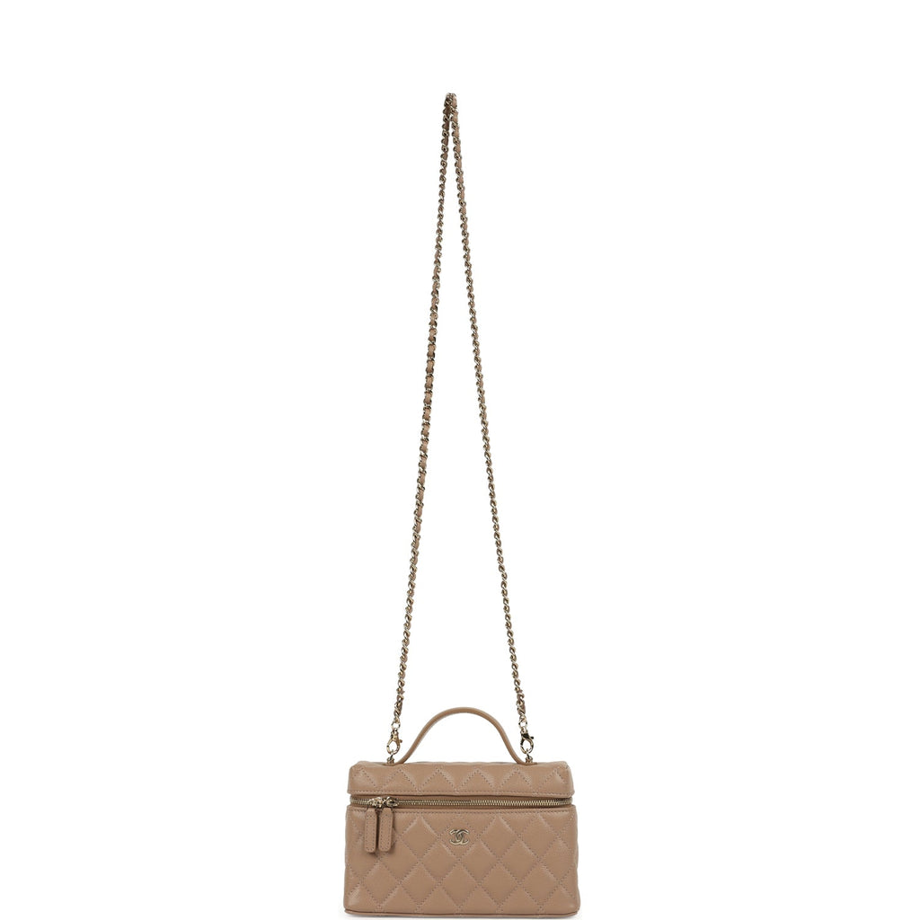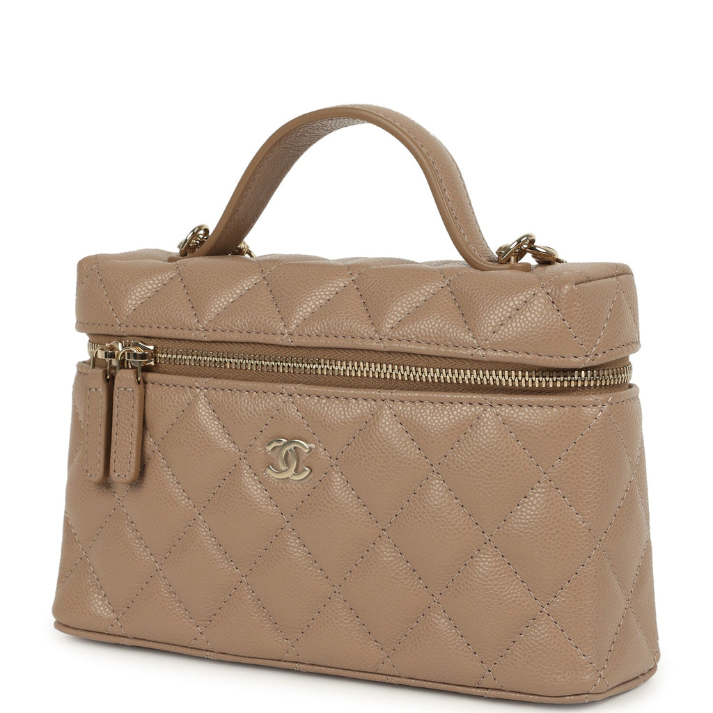 Chanel Top Handle Long Vanity Case with Chain Beige Shiny Caviar Light Gold Hardware