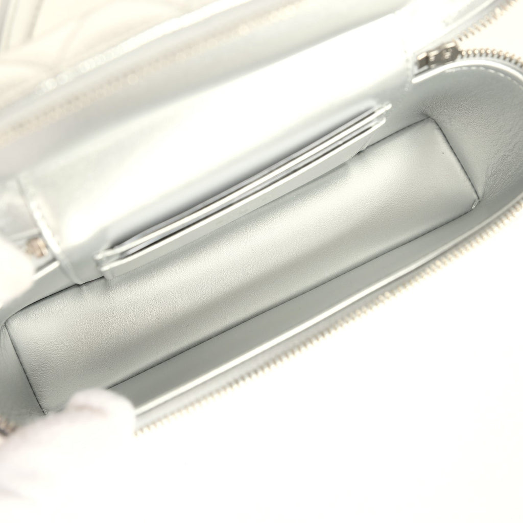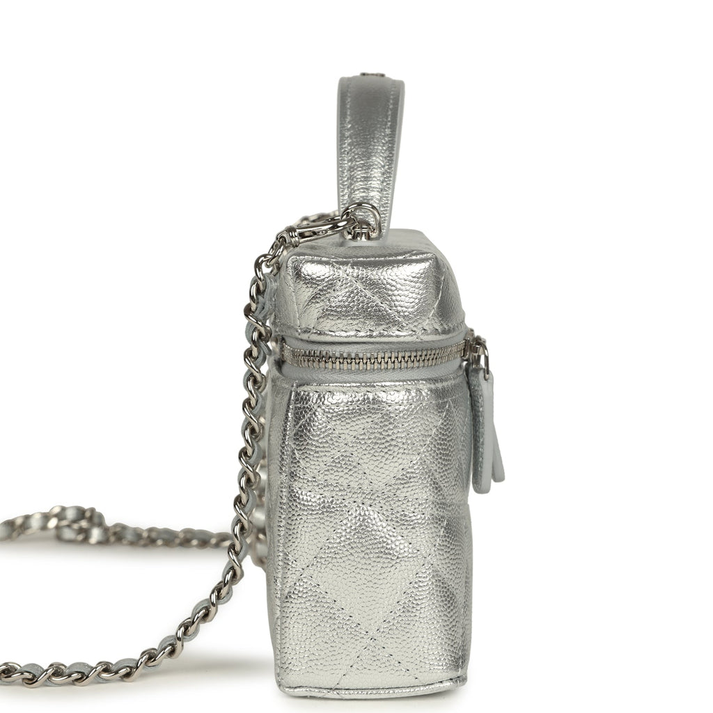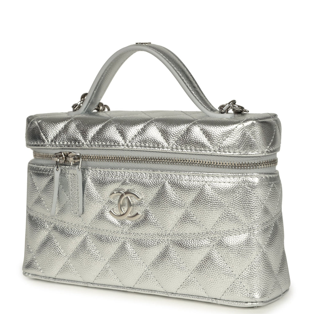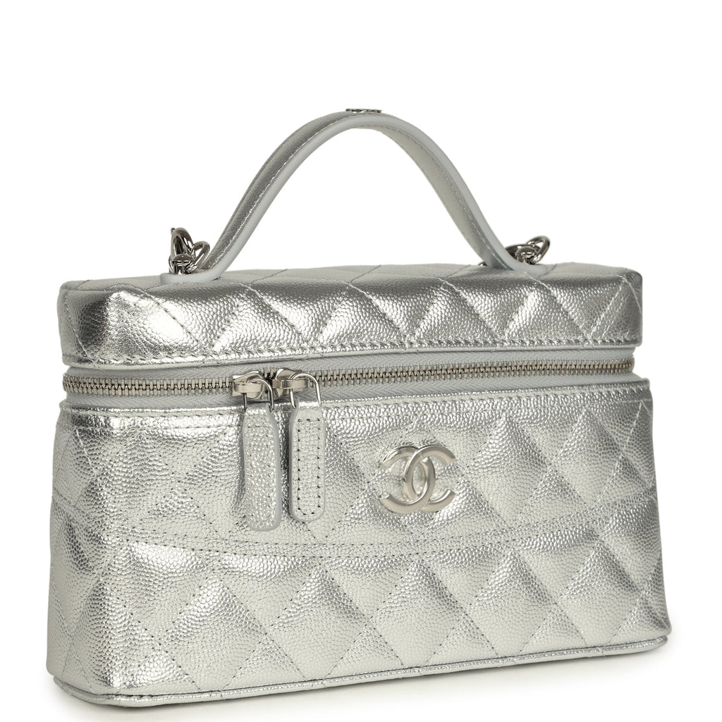 Chanel Top Handle Long Vanity Case with Chain Metallic Silver Shiny Caviar Silver Hardware