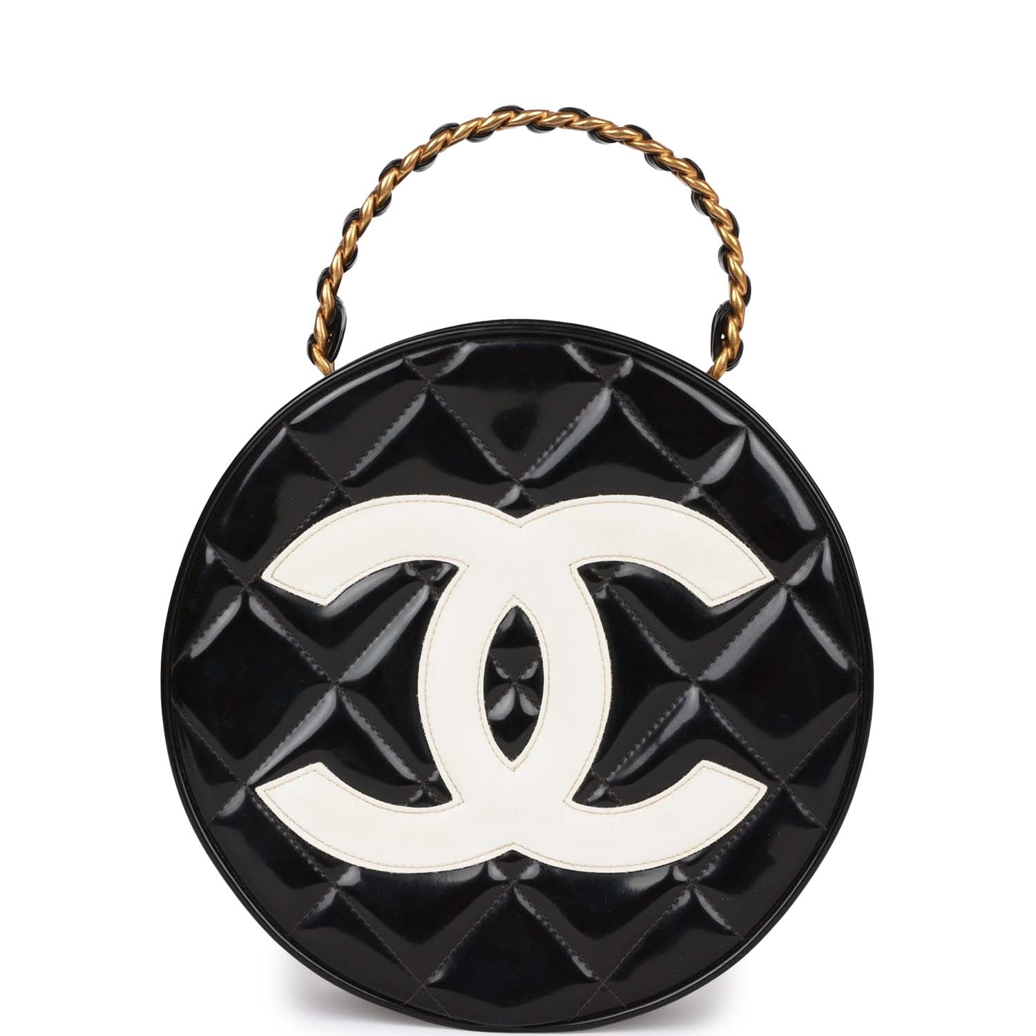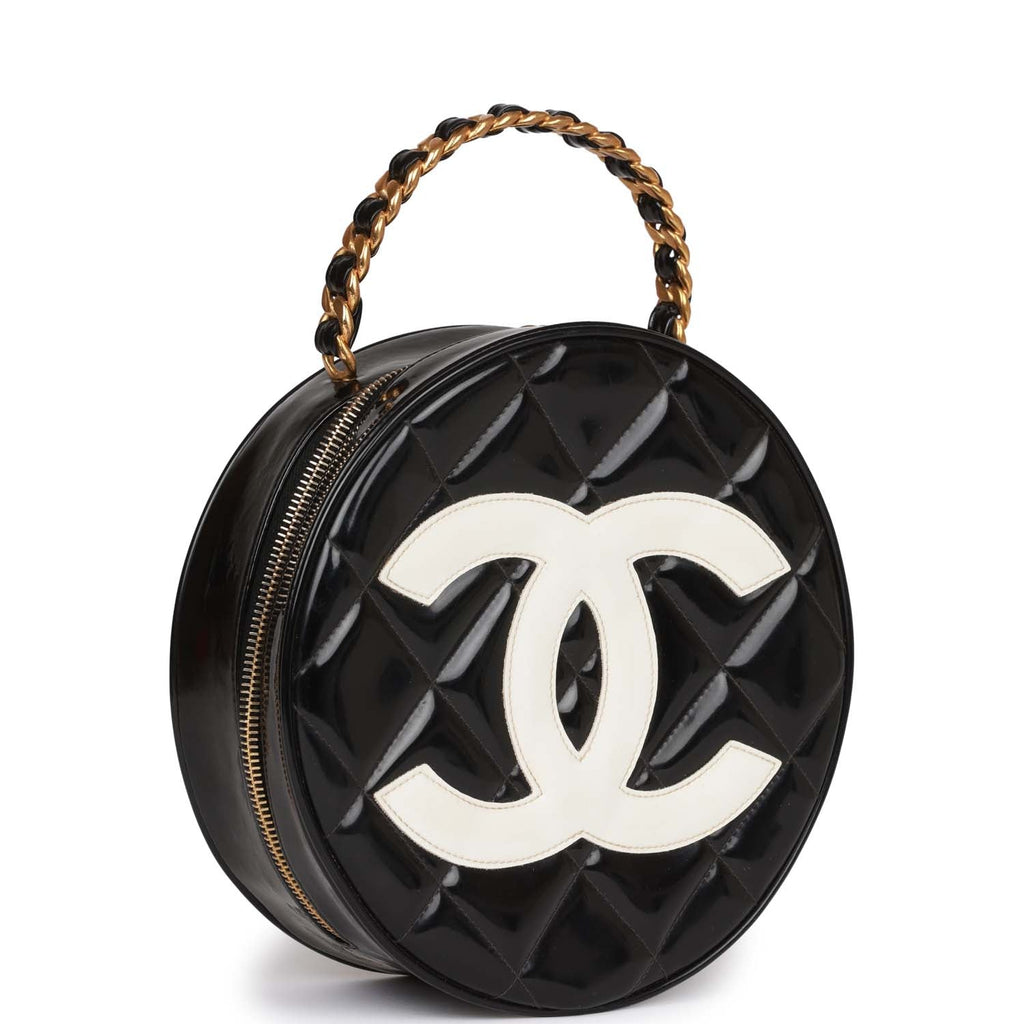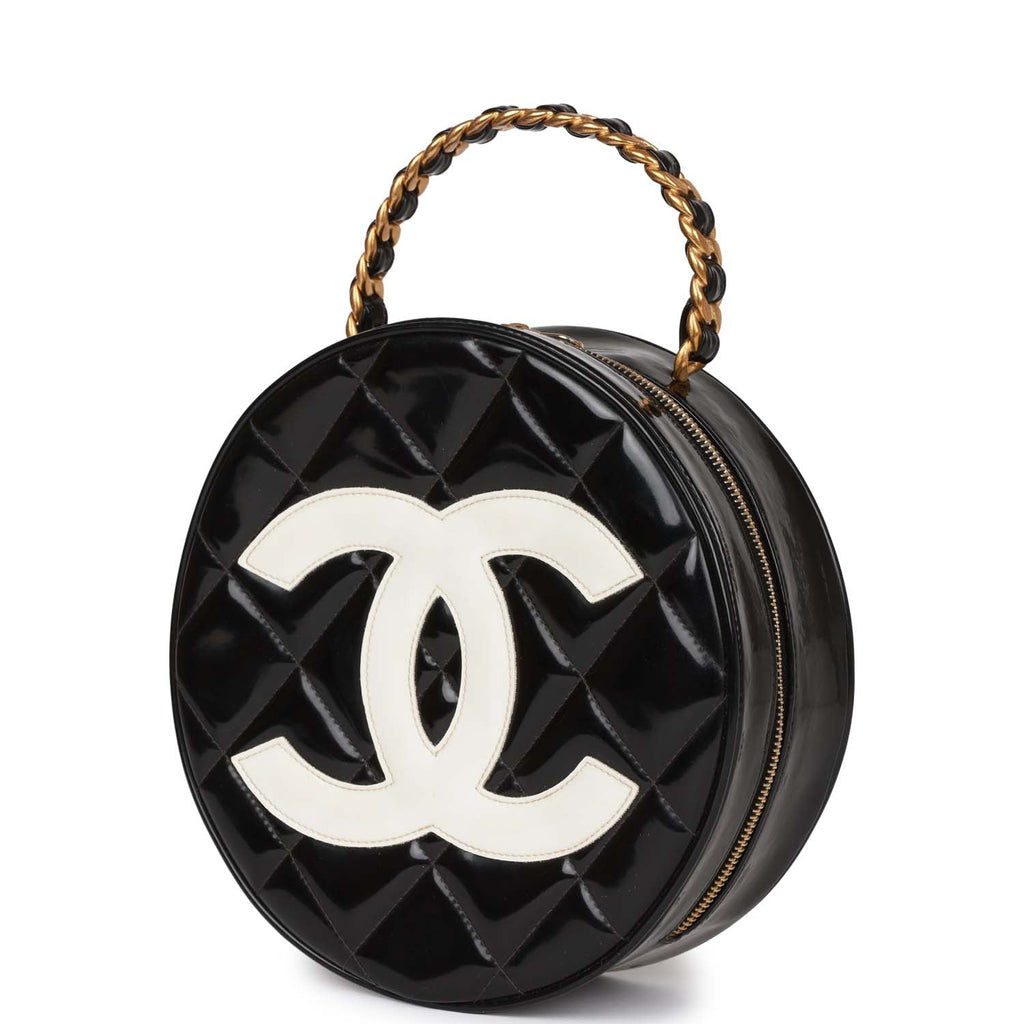 Vintage Chanel Round Vanity Bag Black and White Patent Leather Antique Gold Hardware