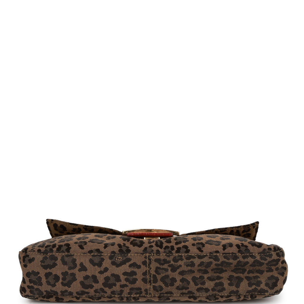 This Fendi Baguette Handbag is in leopard print canvas and Red leather with gold hardware, front flap snap closure, and removable/adjustable red leather shoulder strap.