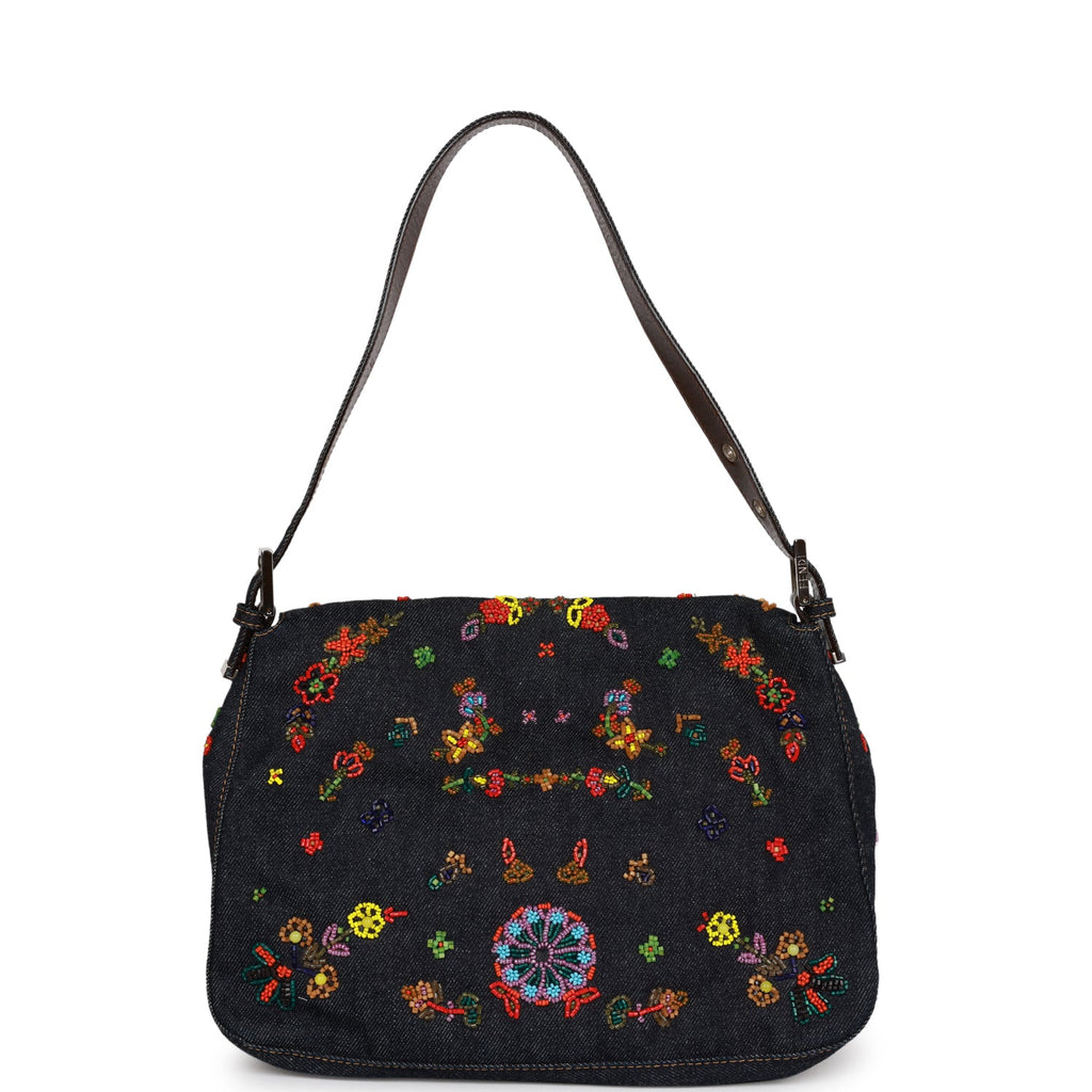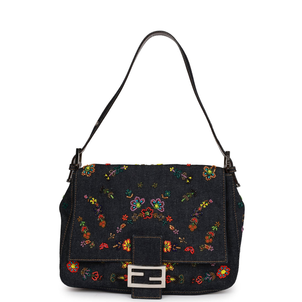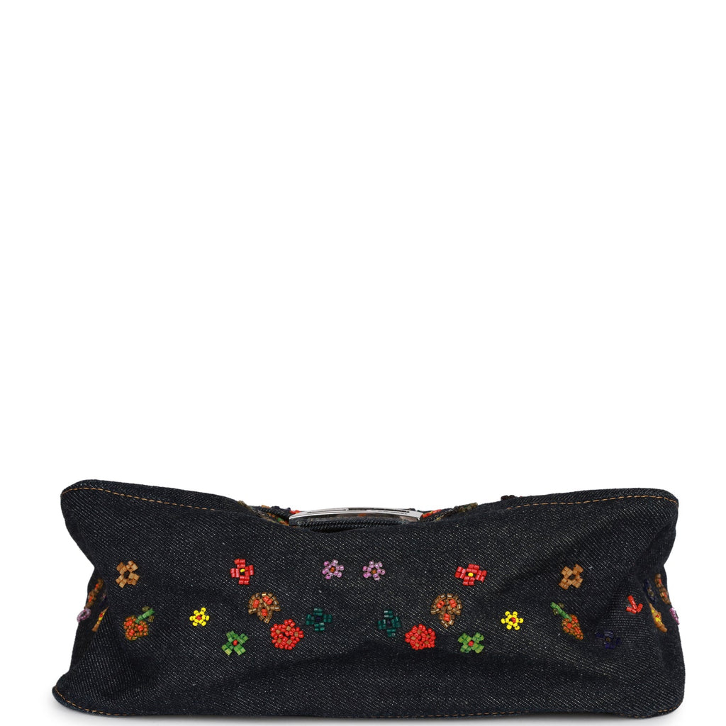 Vintage Fendi Mamma Baguette Bag Ricami Denim Floral Beaded Silver Hardware