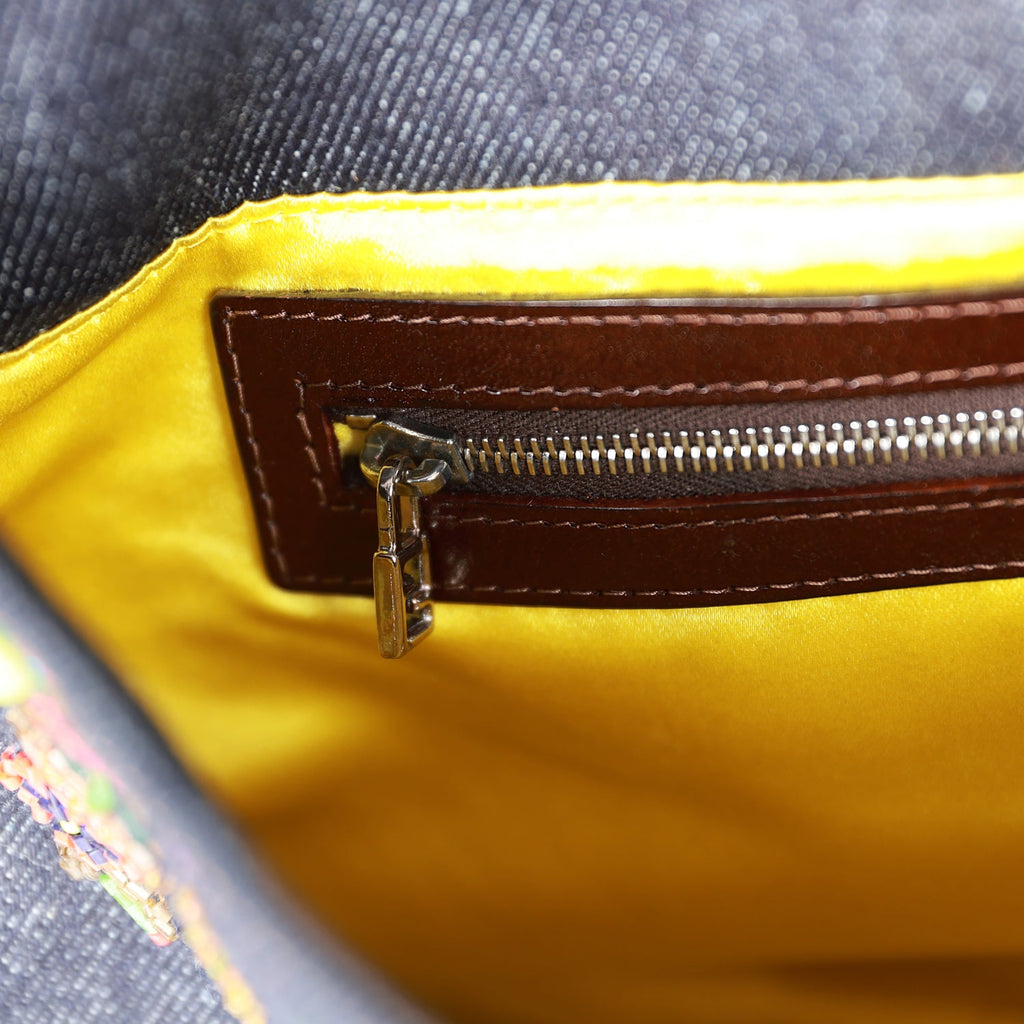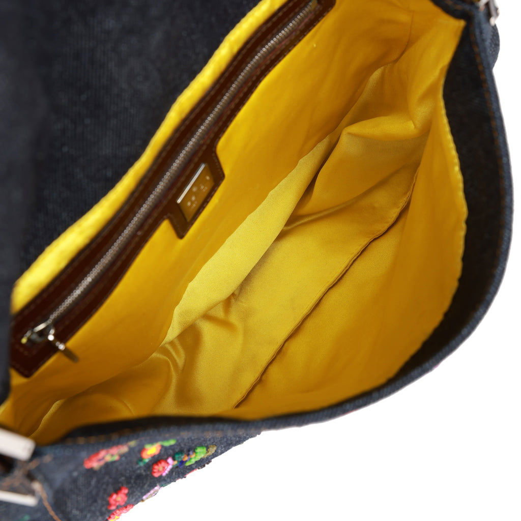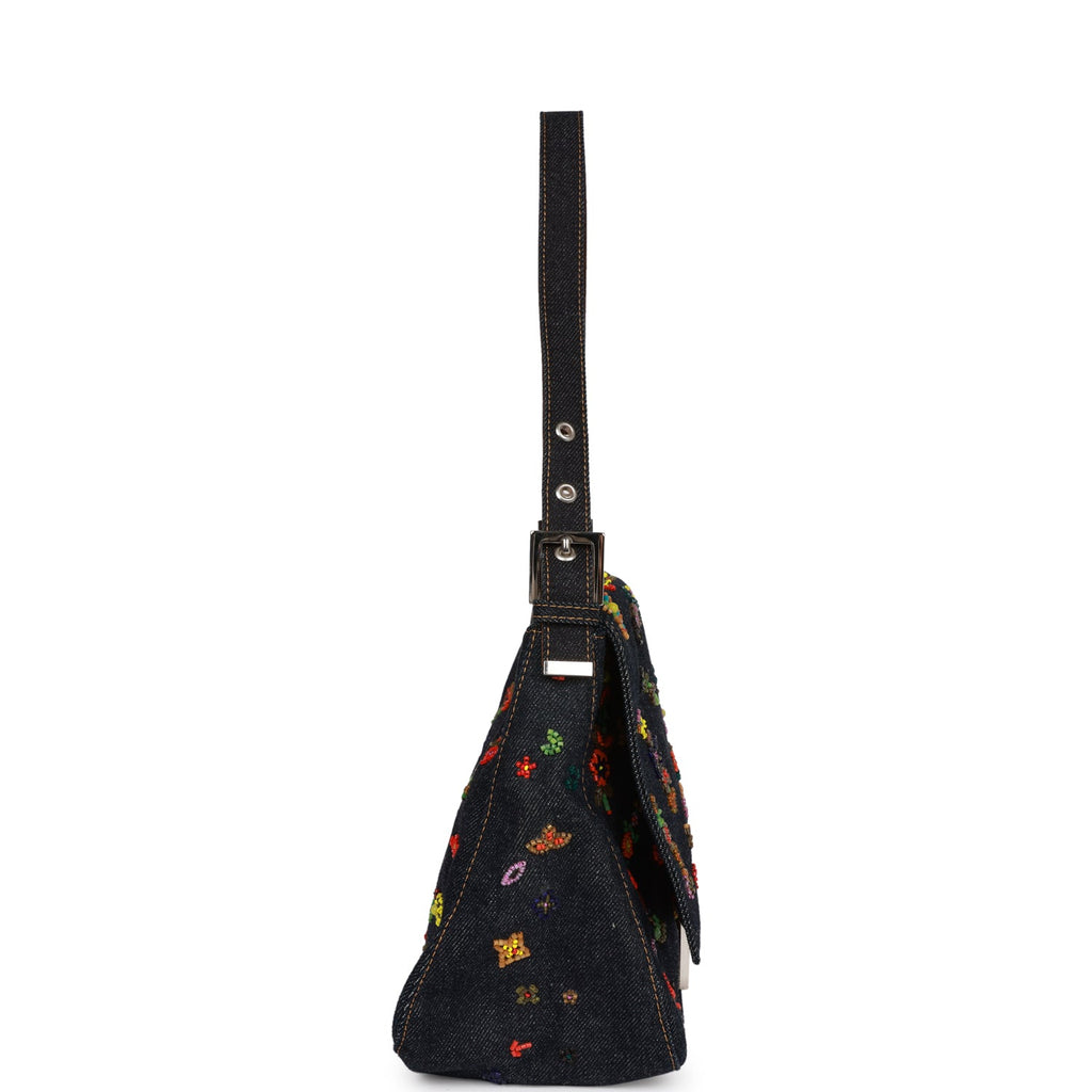 Vintage Fendi Mamma Baguette Bag Ricami Denim Floral Beaded Silver Hardware