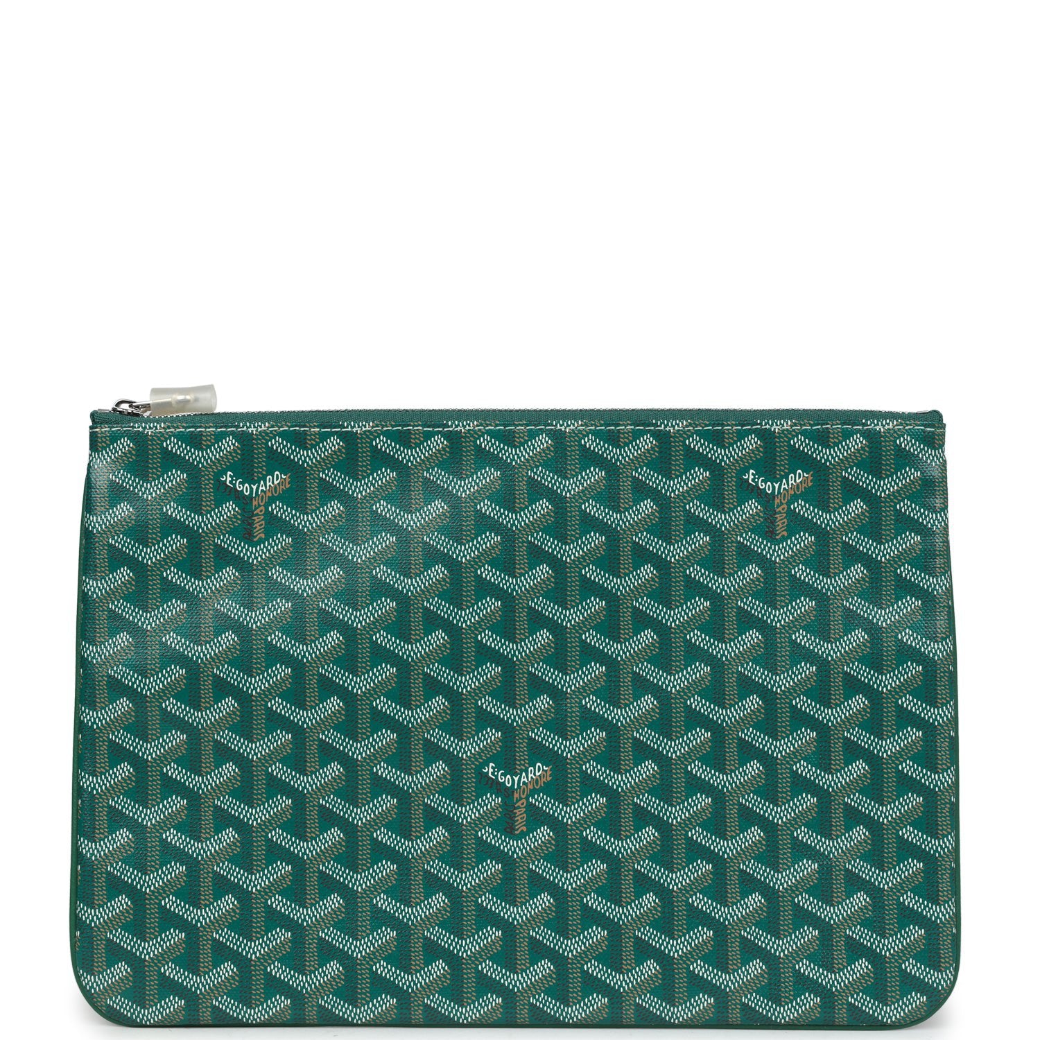 This Senat MM pouch is in Green Goyardine canvas and chevroches calfskin with palladium tone hardware and features a zip top and white stitching.