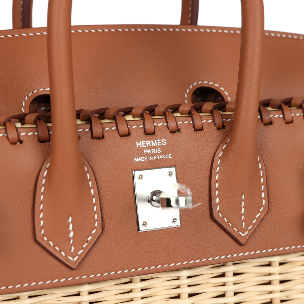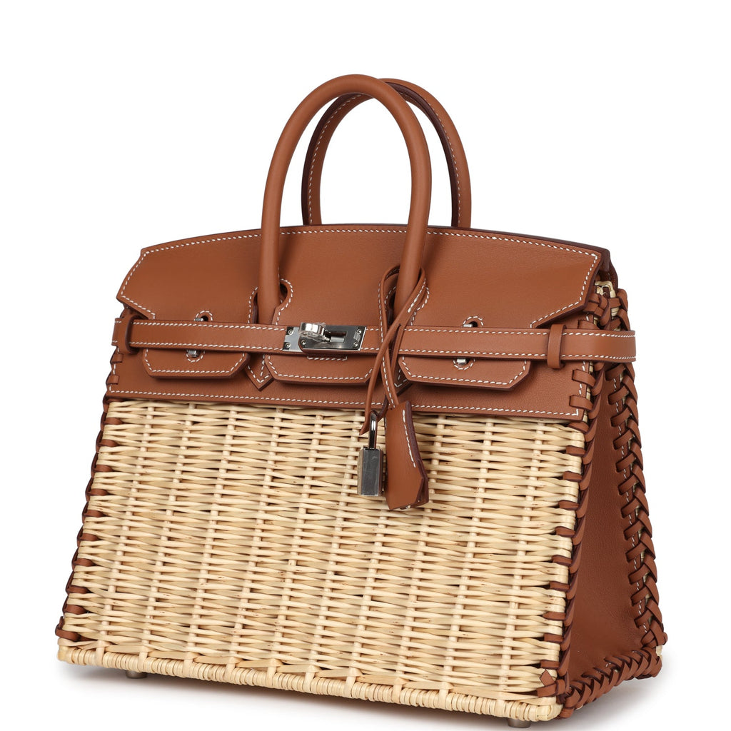 This rare Hermes Birkin 25 Picnic is in Gold swift leather and Naturel Osier wicker with palladium plated hardware and has contrast stitching, front flap, two straps with toggle closure and double top handles.