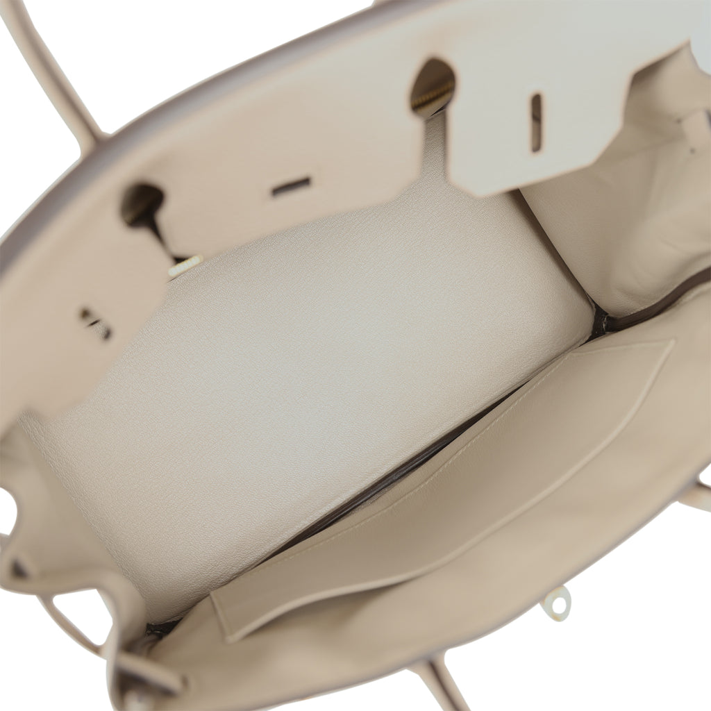 The interior is lined with Gris Tourterelle chevre and has a zip pocket with an Hermes engraved zipper pull and an open pocket on the opposite side.