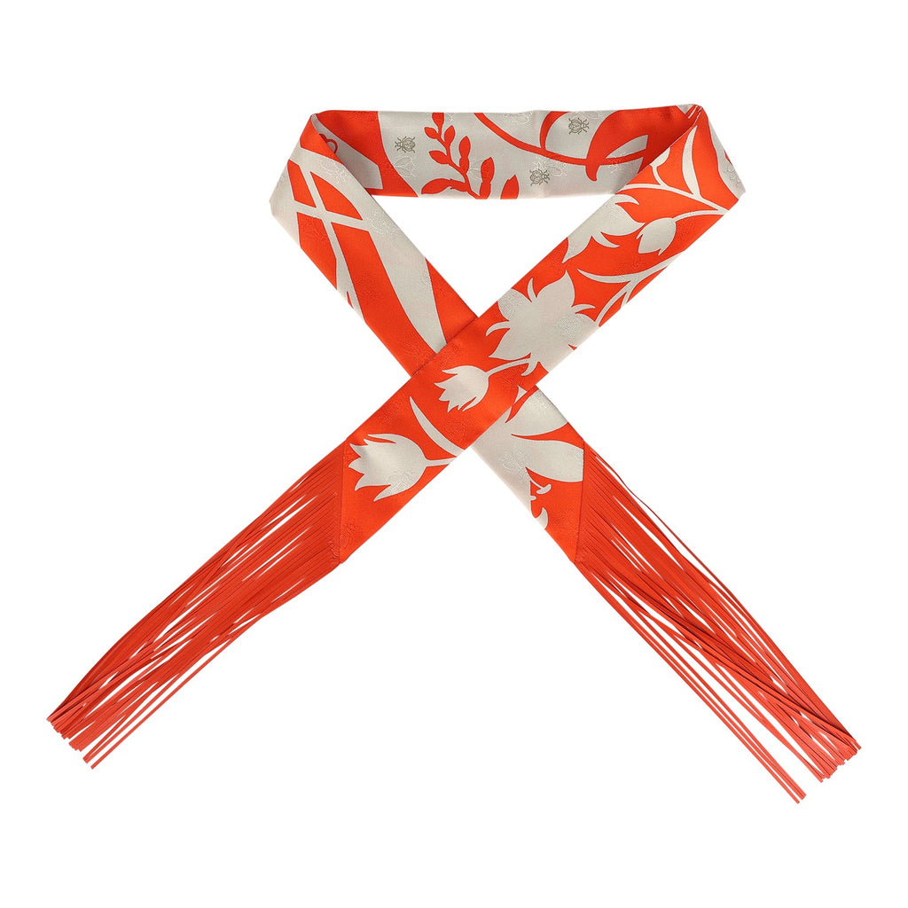 This Hermes "Bouquet Final" Silk Twilly in Gris Perle and Vermillon is designed by Katie Scott, featuring a Vermillion leather fringe.