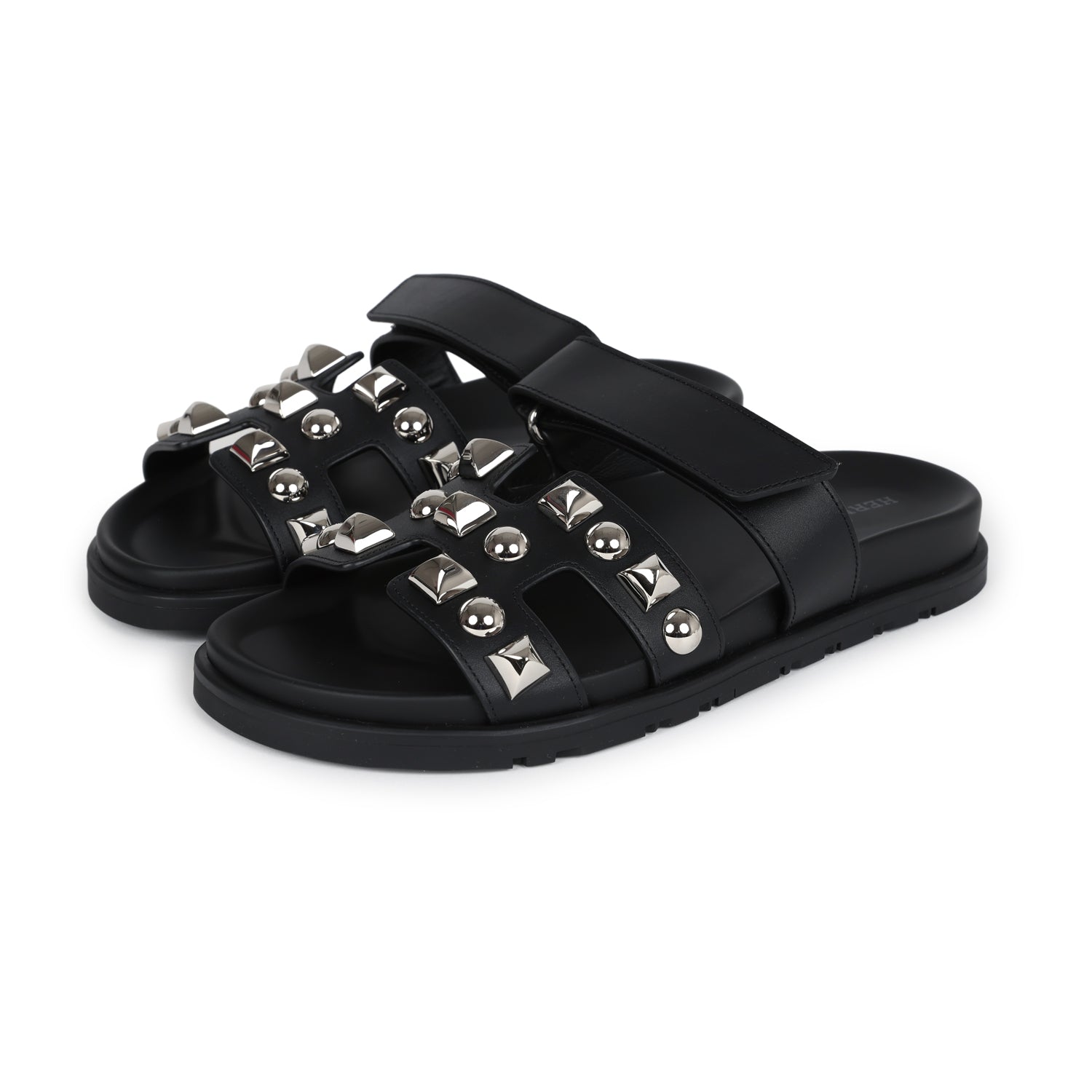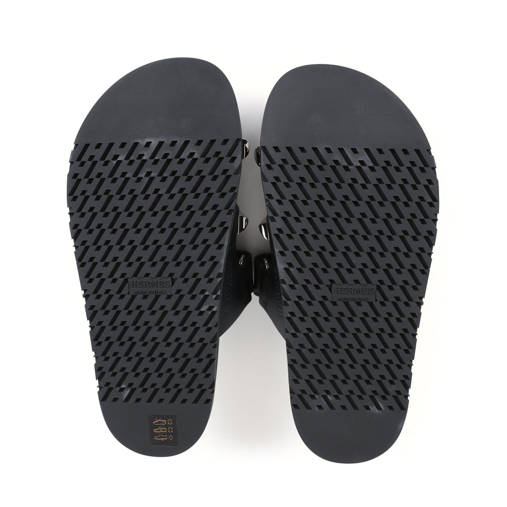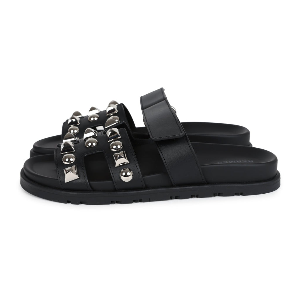 Hermes Chypre Techno Sandals Black Studded Calfskin Palladium Hardware 37.5 EU