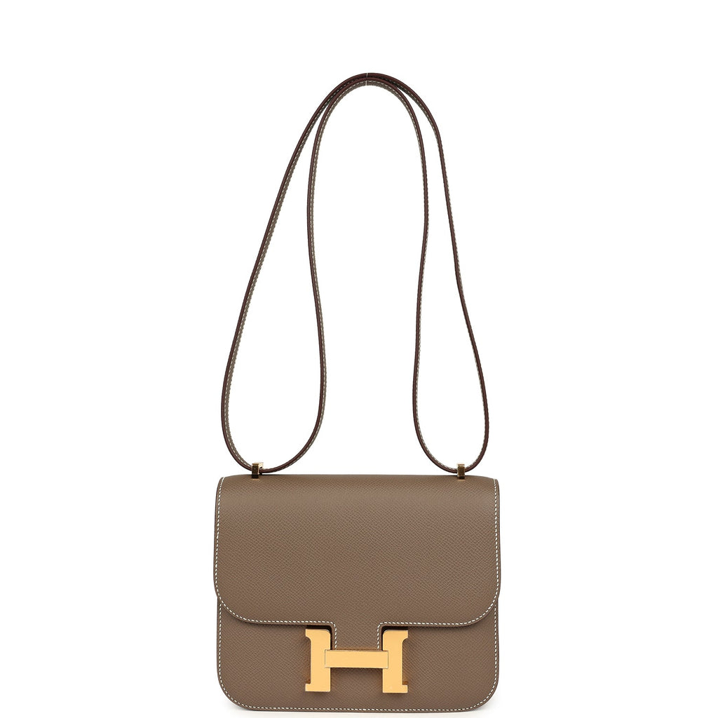 This Constance is in Etoupe epsom leather with gold hardware and has contrast stitching, a metal "H" snap lock closure and adjustable shoulder strap.
