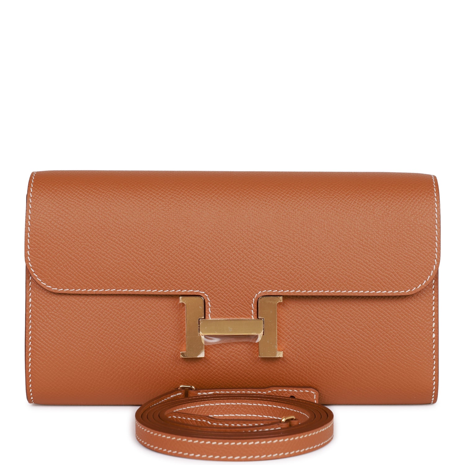 This Constance Wallet To Go is in gold epsom leather with gold hardware and has contrast stitching, metal "H" snap lock closure, open front compartment and removable crossbody strap.