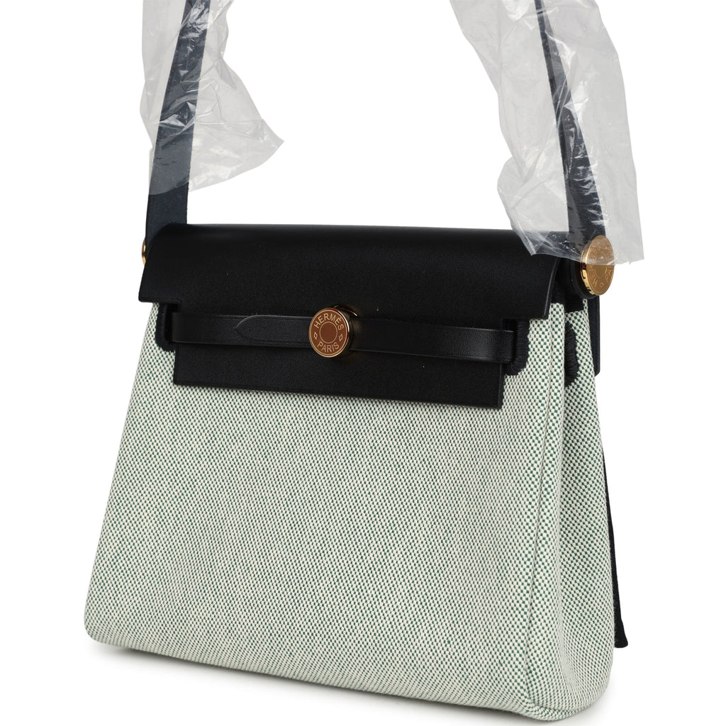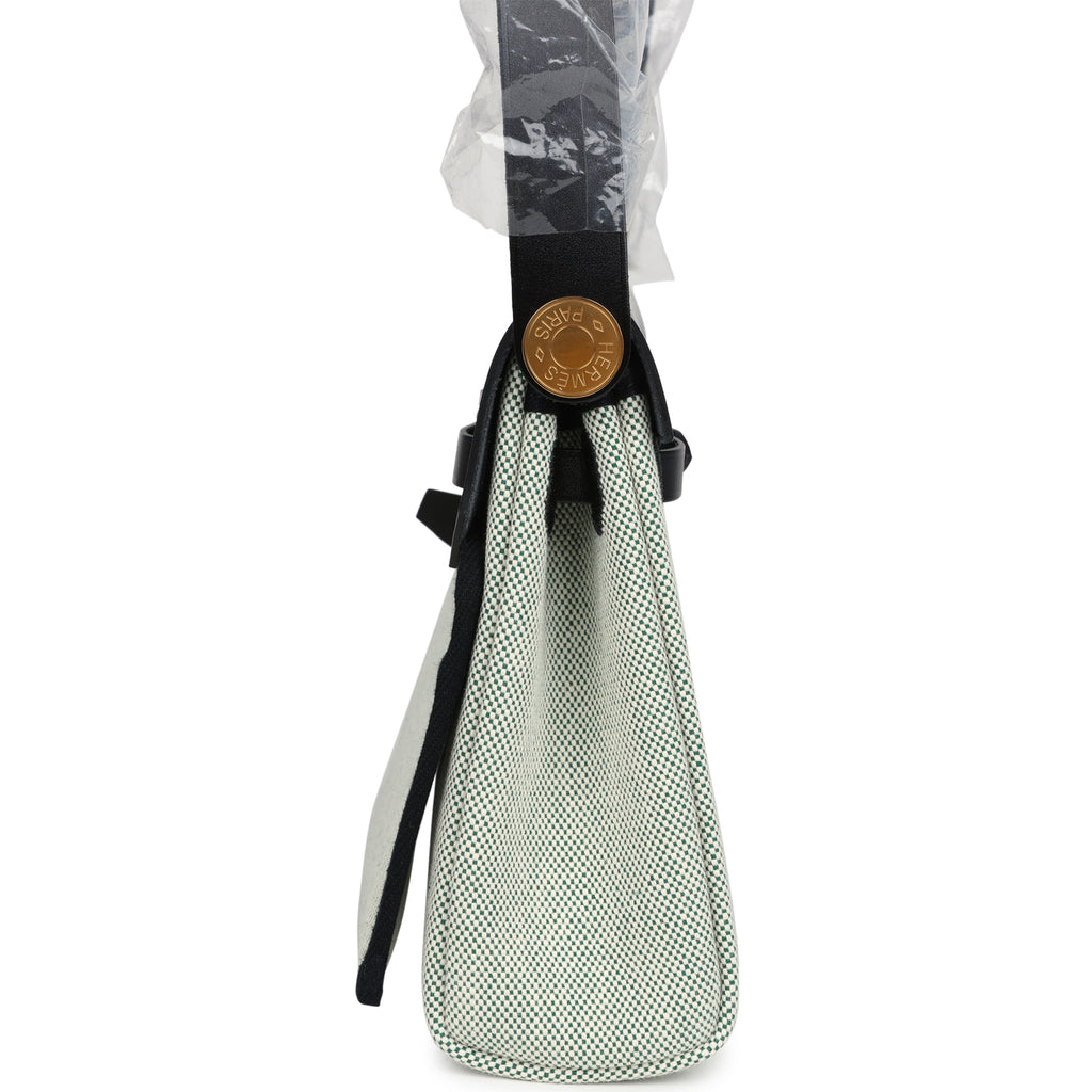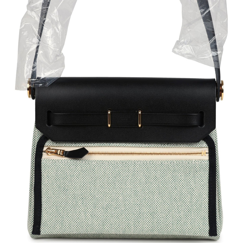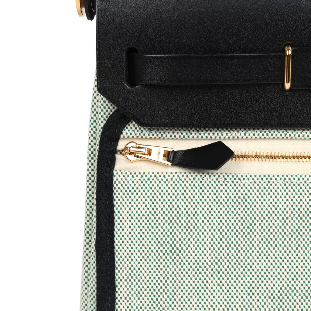 Hermes Herbag Zip 20 Mini Ecru and Vert Moyen Toile H Canvas and Black Vache Hunter Gold Hardware