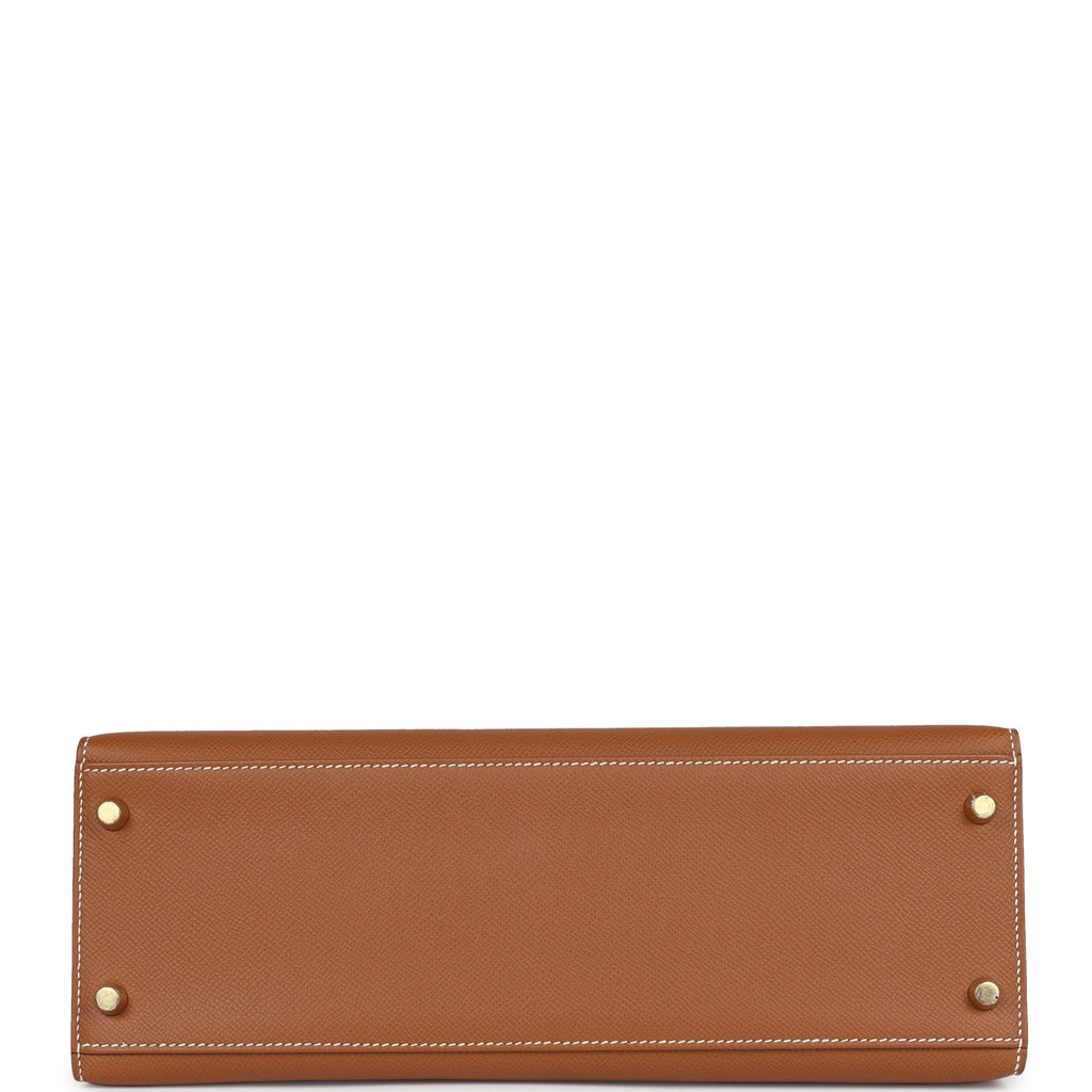 This Kelly, in the Sellier style, is in Gold epsom leather with gold hardware and has contrast stitching, two straps with front toggle closure, clochette with lock and two keys, single rolled handle and optional shoulder strap.