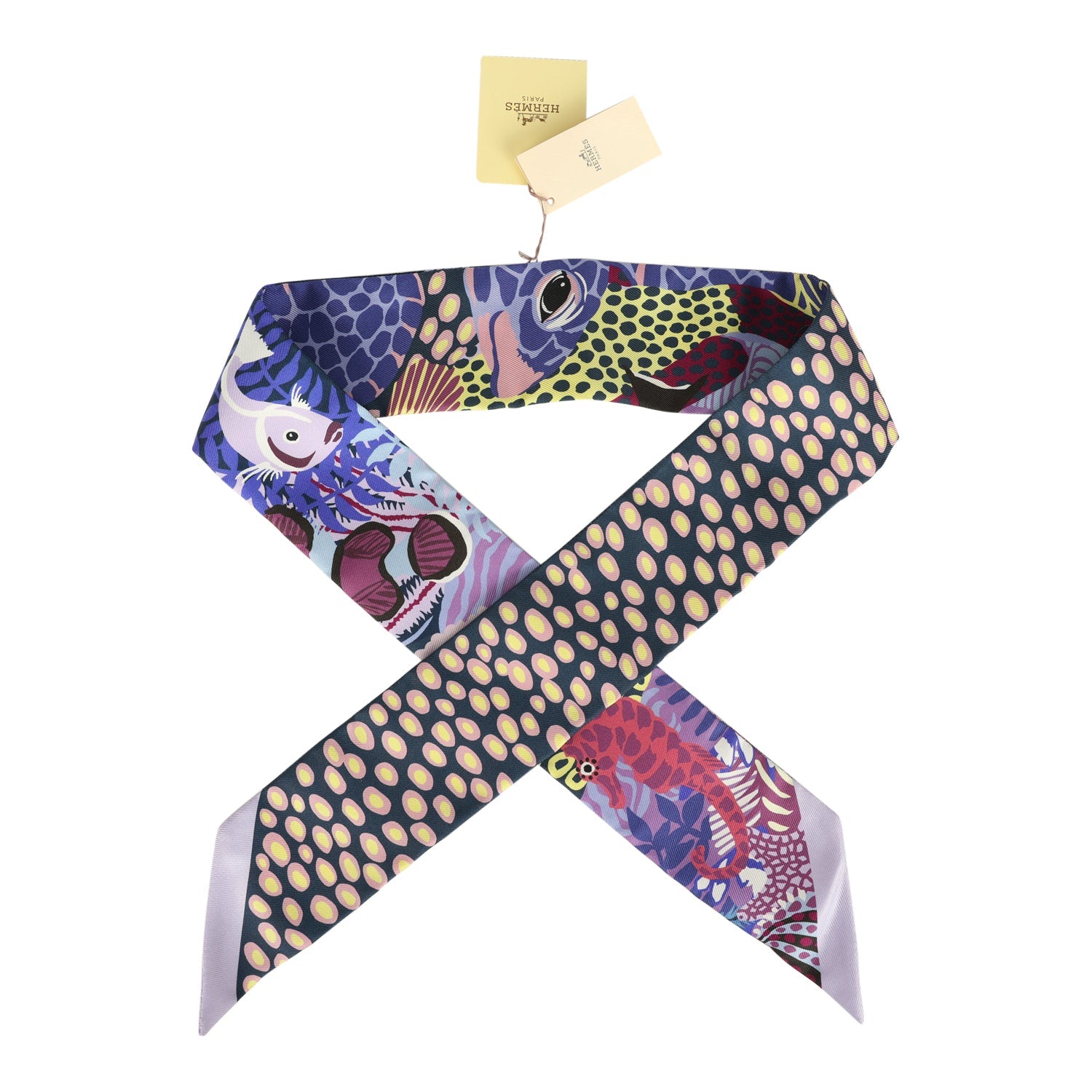 Hermes "Under the Waves" Mauve, Marine and Jaune Silk Twilly Pair