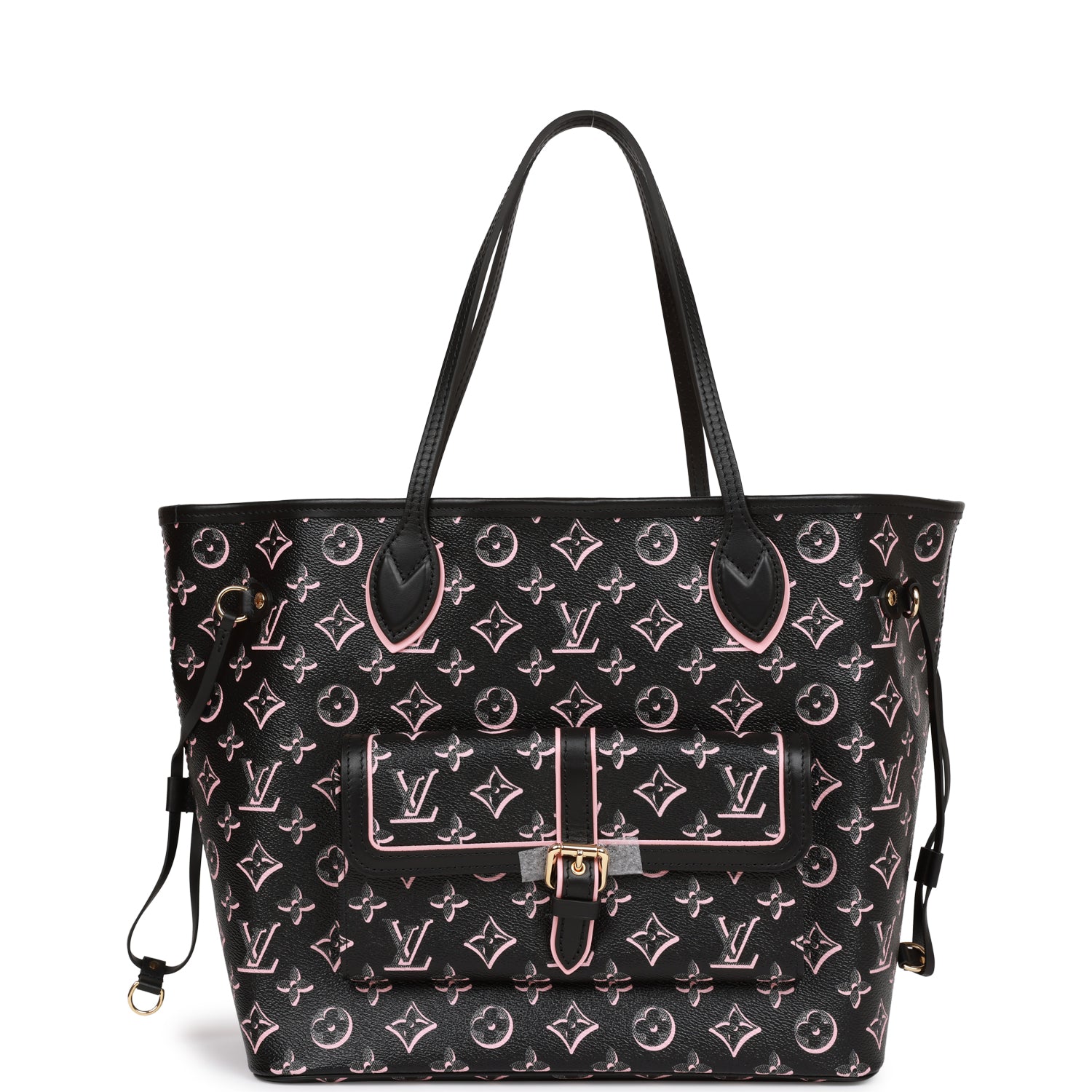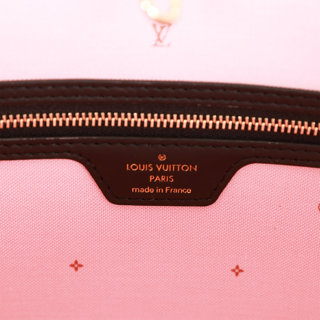 This limited edition "Fall For You" Neverfull MM tote in black and pink monogram canvas with golden tone hardware and features a removable pouch, magnetic front pocket, black leather top strap handles, trim and side cinch cords with polished gold tone hardware and hidden top hook closure.