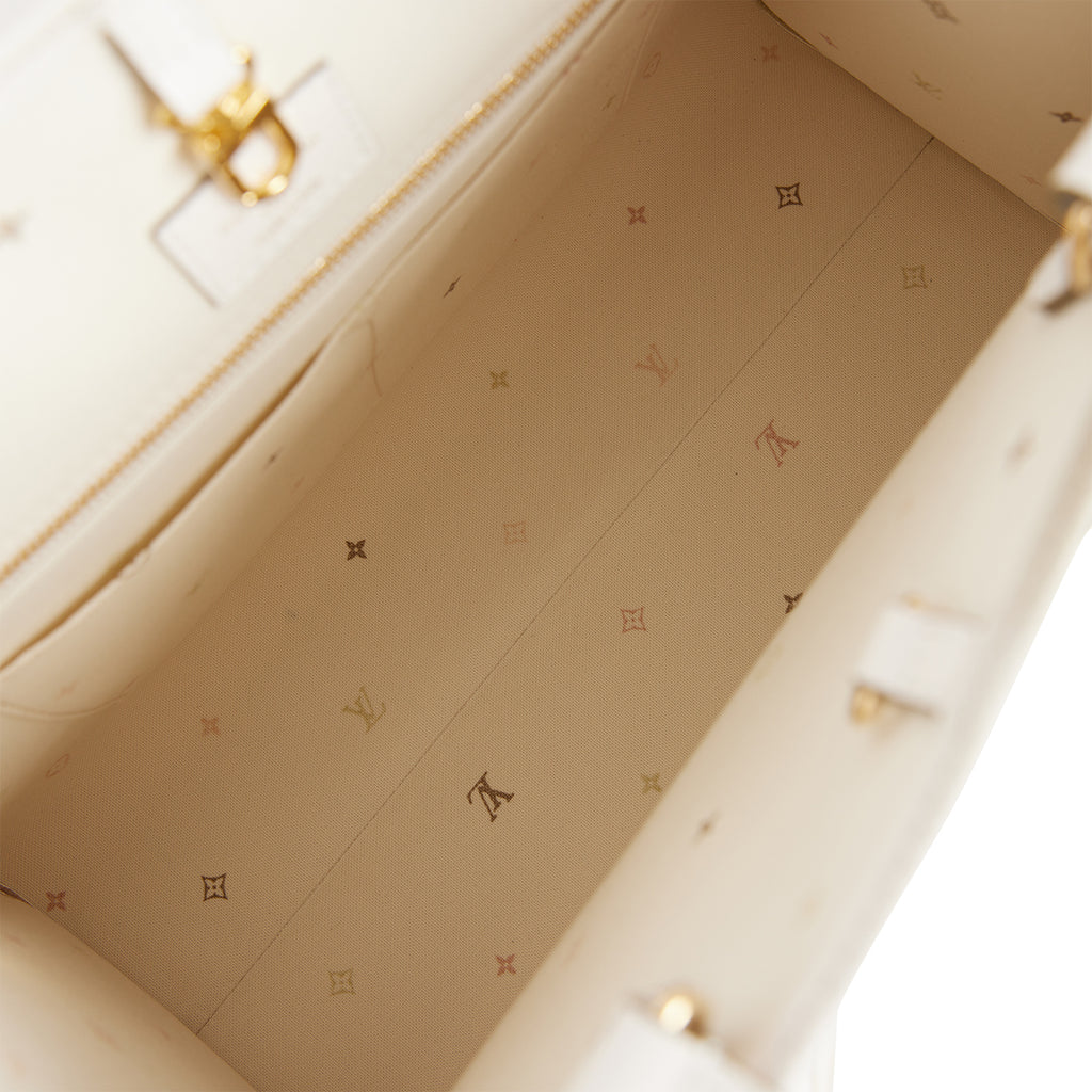 This OnTheGo tote is of sunset monogram canvas with polished brass hardware and features gradient monogram print, top handles, trim and white leather hidden interior shoulder straps with polished gold tone hardware and hidden top hook closure.