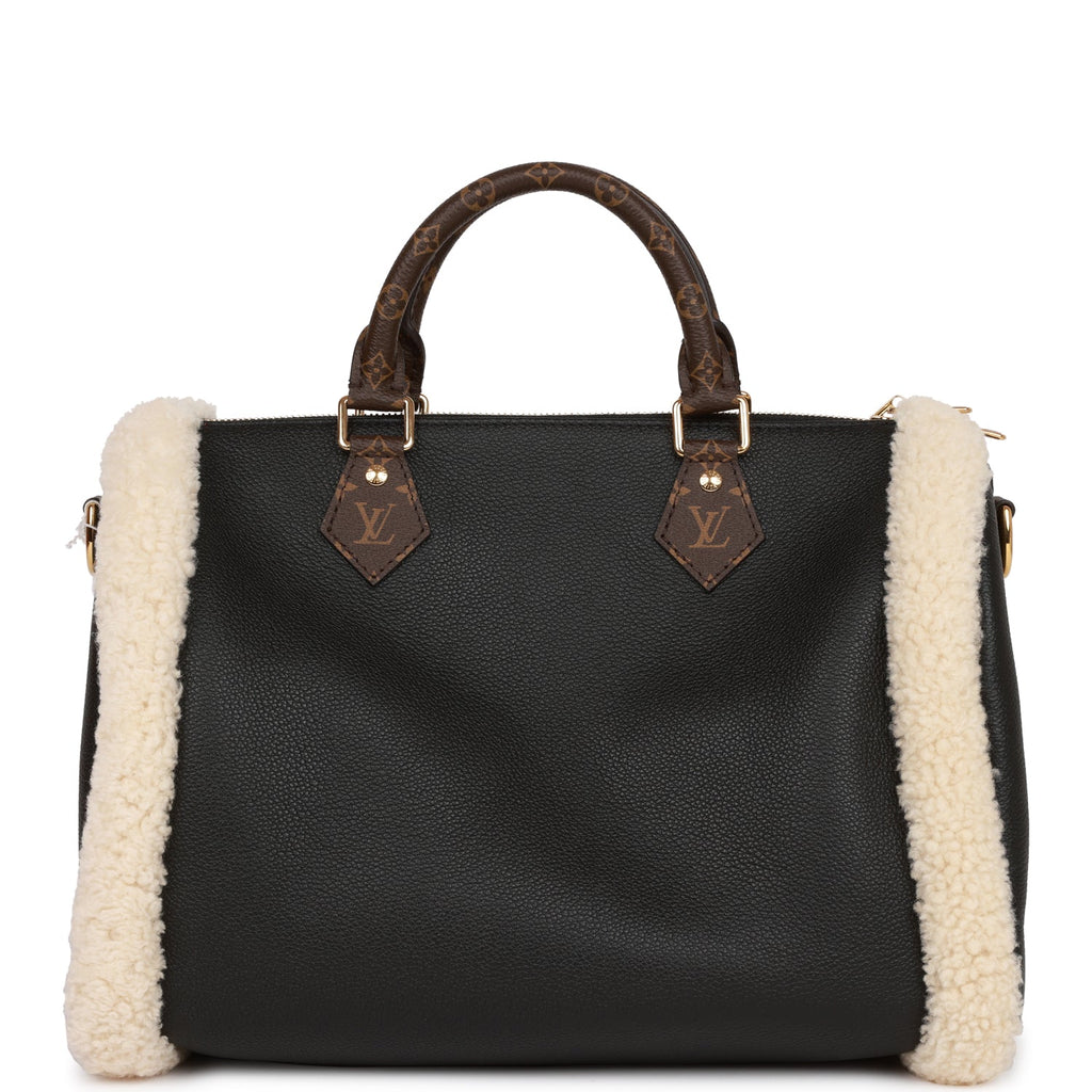 This limited edition Speedy 25 Bandouliere is of Black leather and shearling wool with polished brass hardware and features giant monogram shearling, brown canvas top strap handles, trim and removable strap with polished gold tone hardware and zip top closure.
