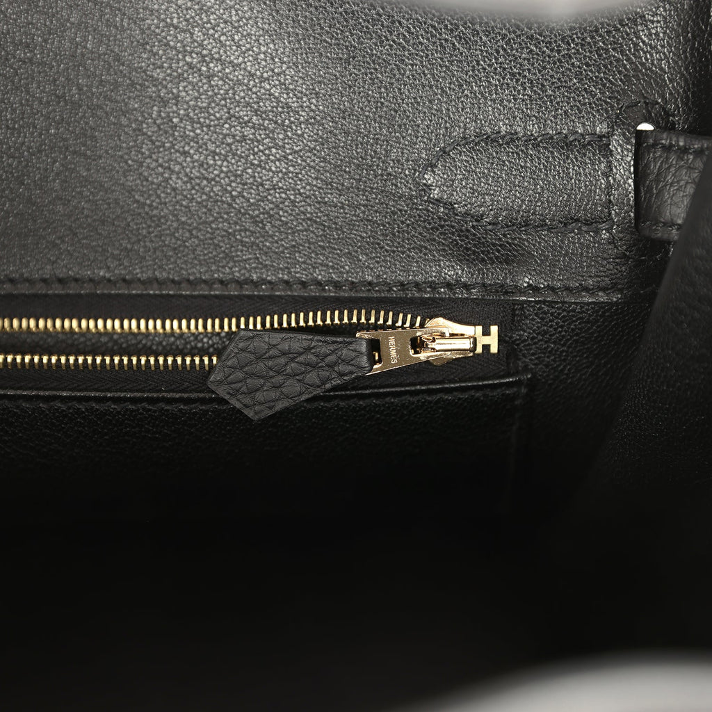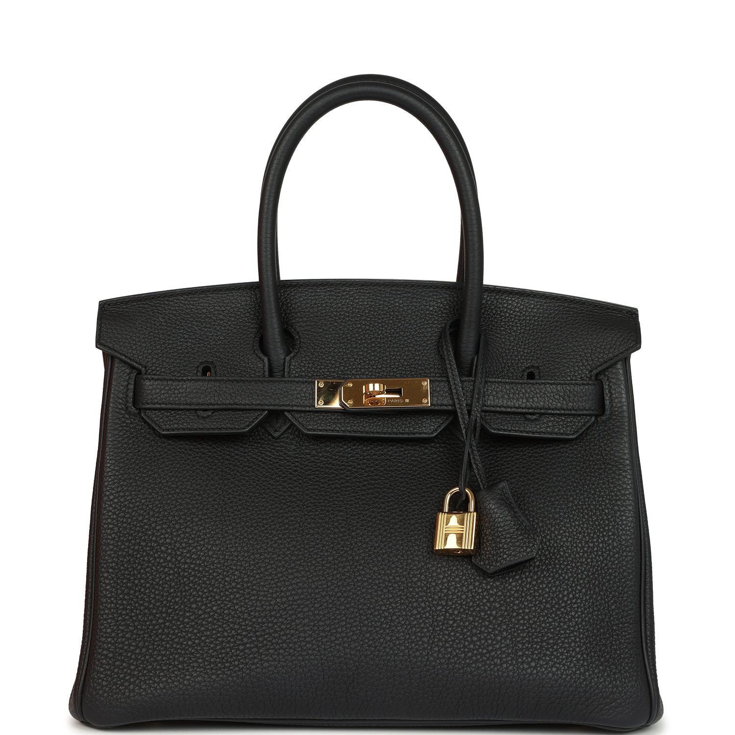 This Birkin is in Black togo leather with gold hardware and features tonal stitching, front flap, two straps with center toggle closure, clochette with lock and two keys, and double rolled handles.