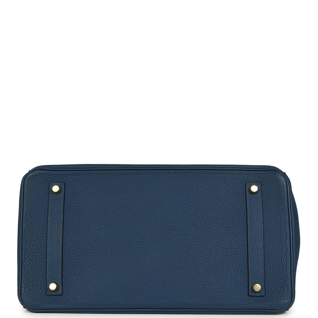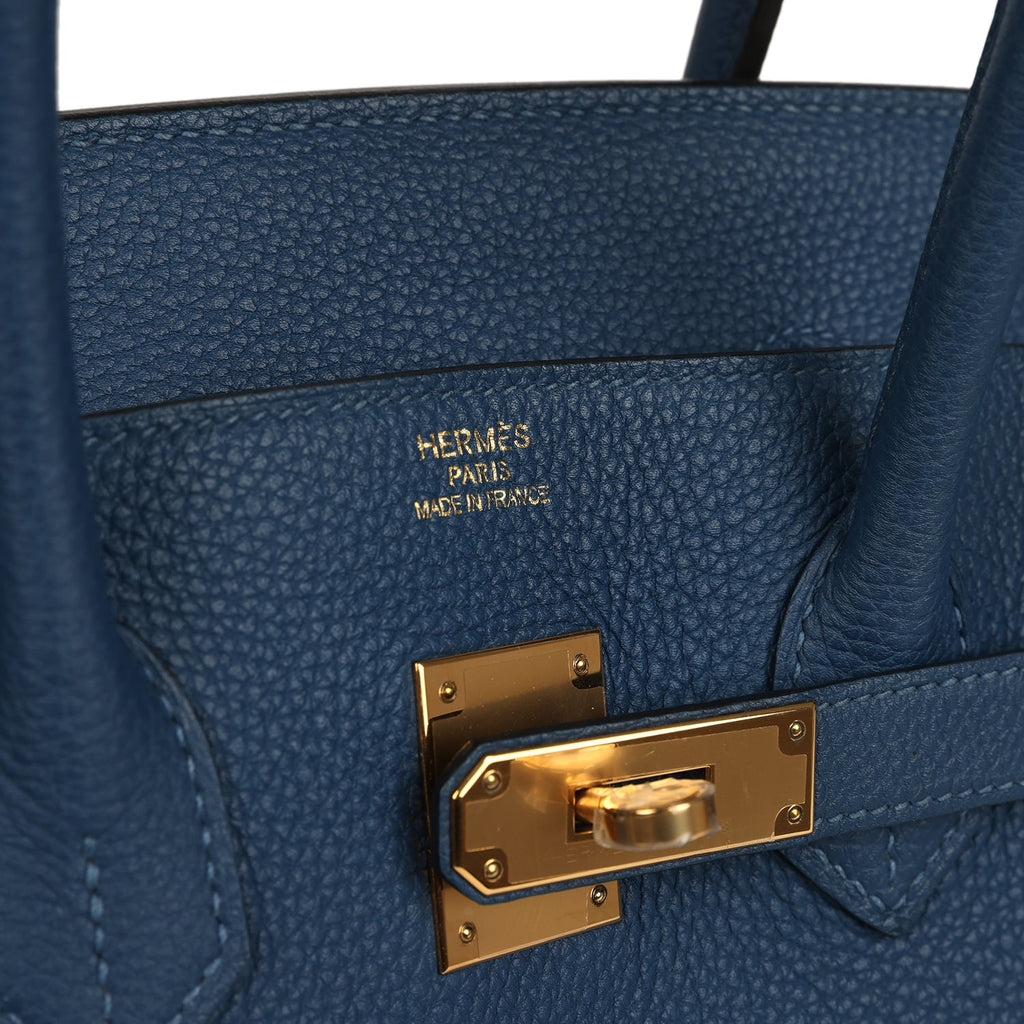 This Birkin is Deep Bleu togo leather with gold hardware and has tonal stitching, front flap, two straps with center toggle closure, clochette with lock and one key, and double rolled handles.