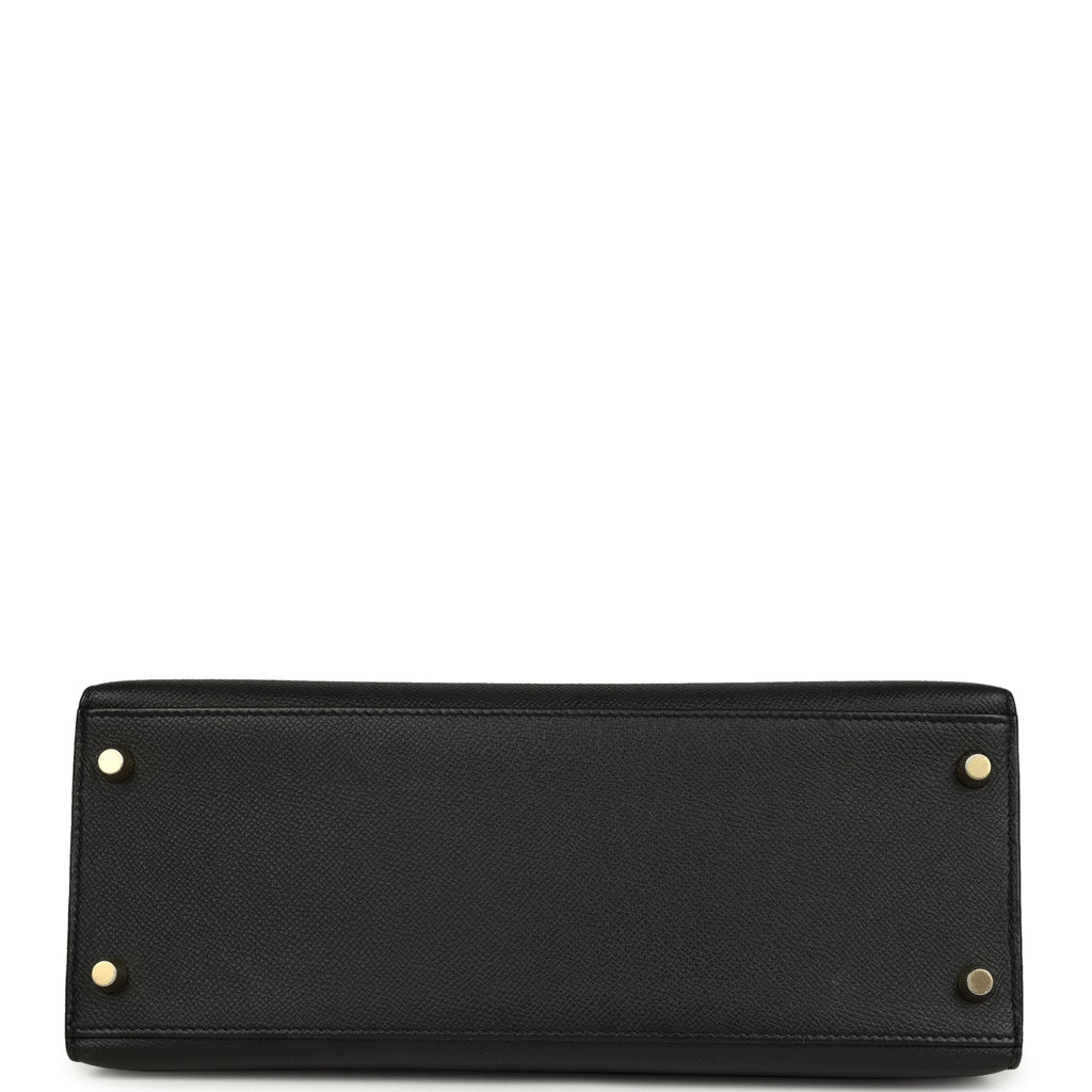 This Kelly, in the Sellier style, is in Black epsom leather with gold hardware and has tonal stitching, front flap, two straps with center toggle closure, clochette with lock and two keys, single rolled handle and removable shoulder strap.