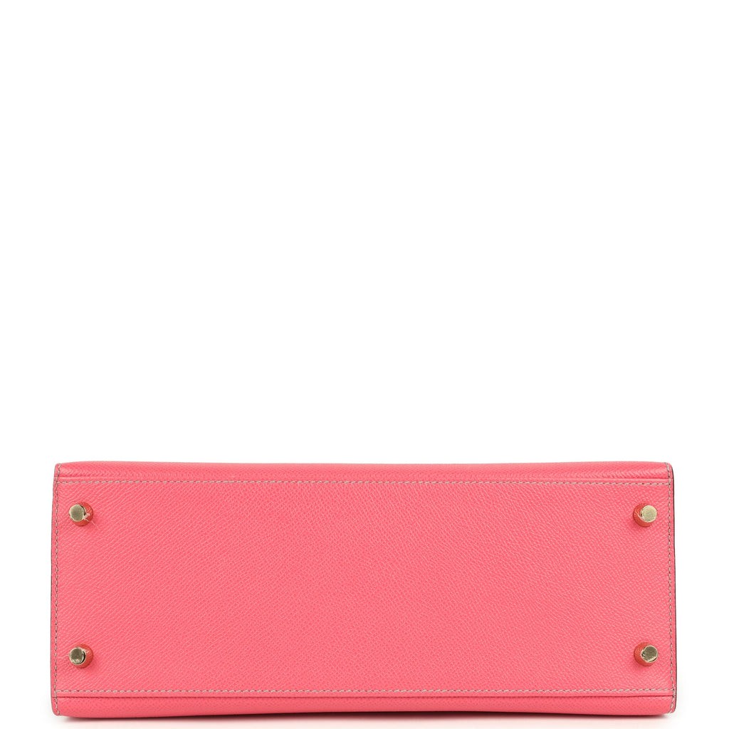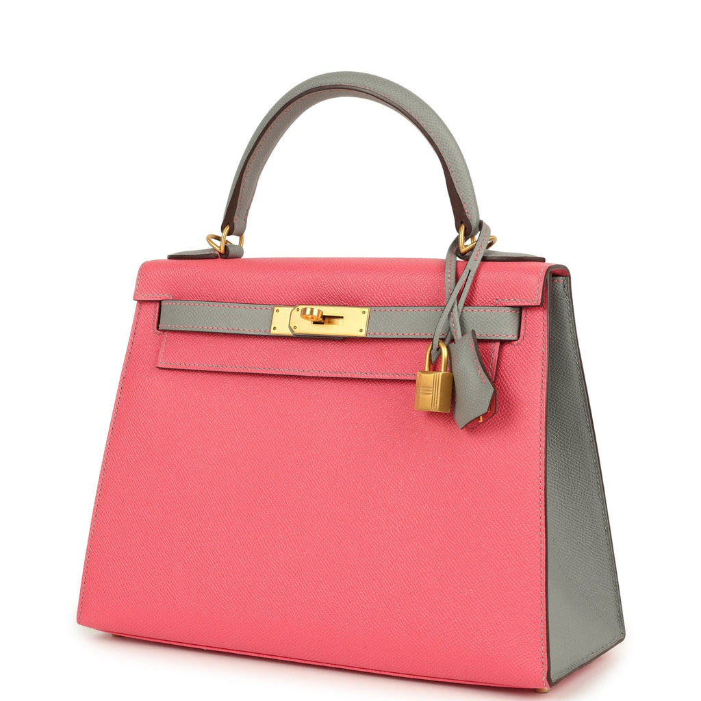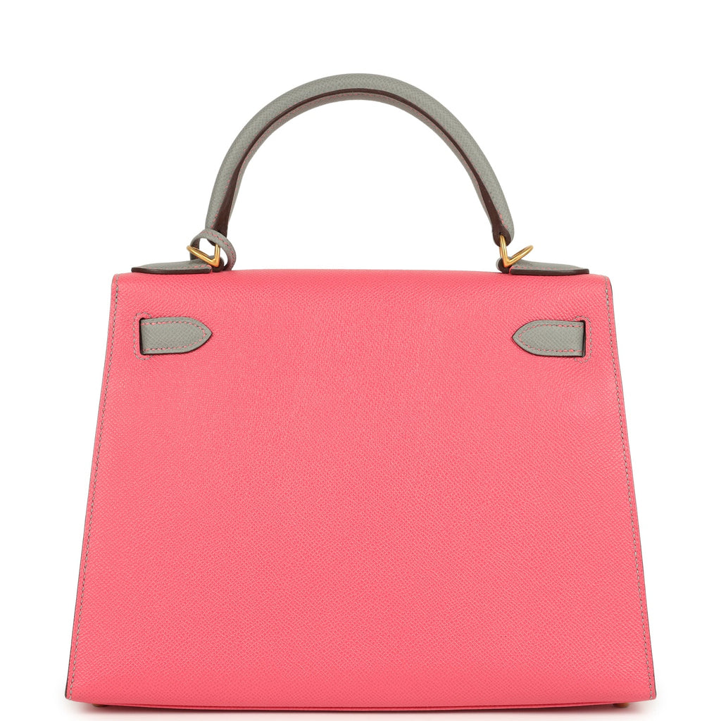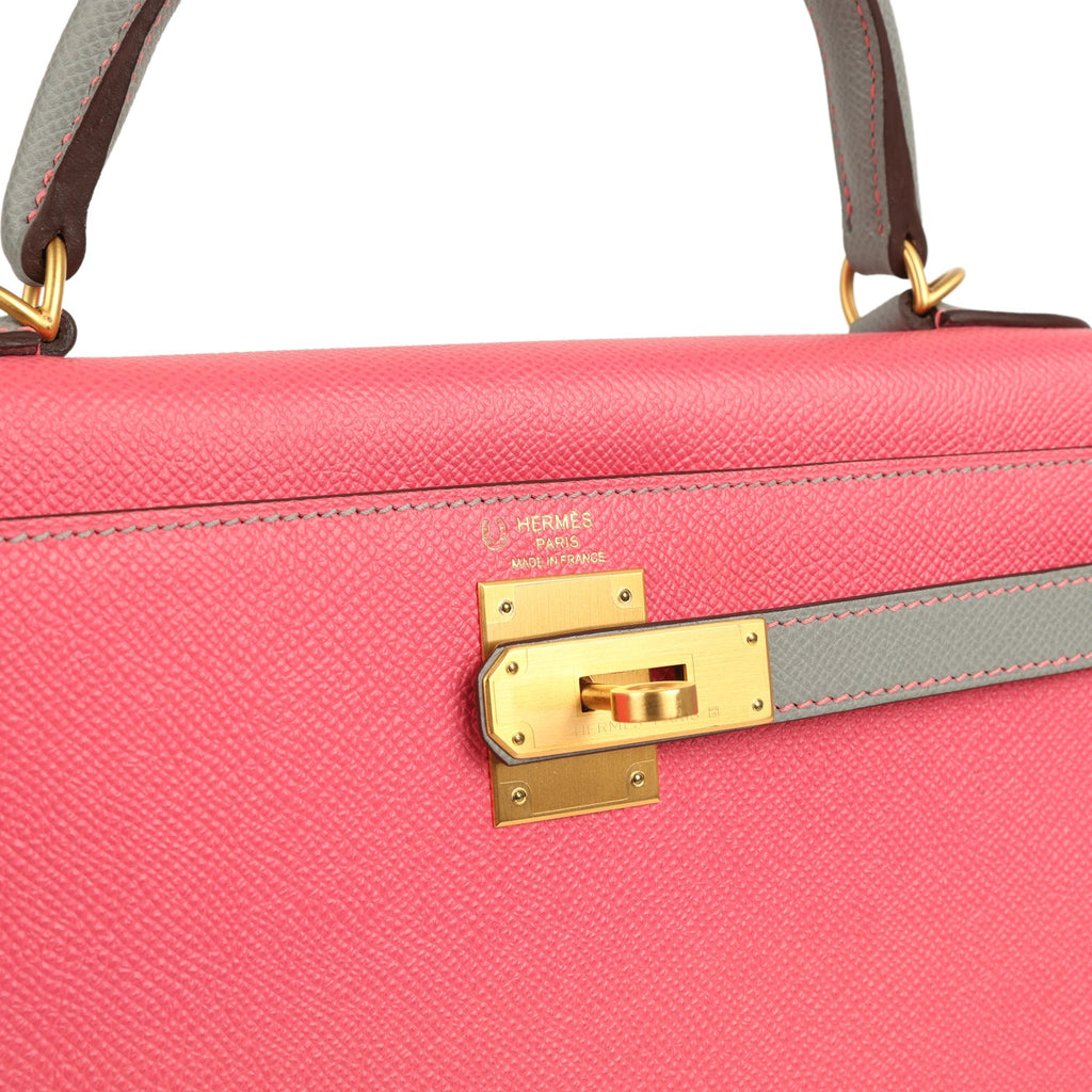 Pre-owned Hermes Special Order (HSS) Kelly Sellier 28 Rose Azalee and Gris Mouette Epsom Brushed Gold Hardware