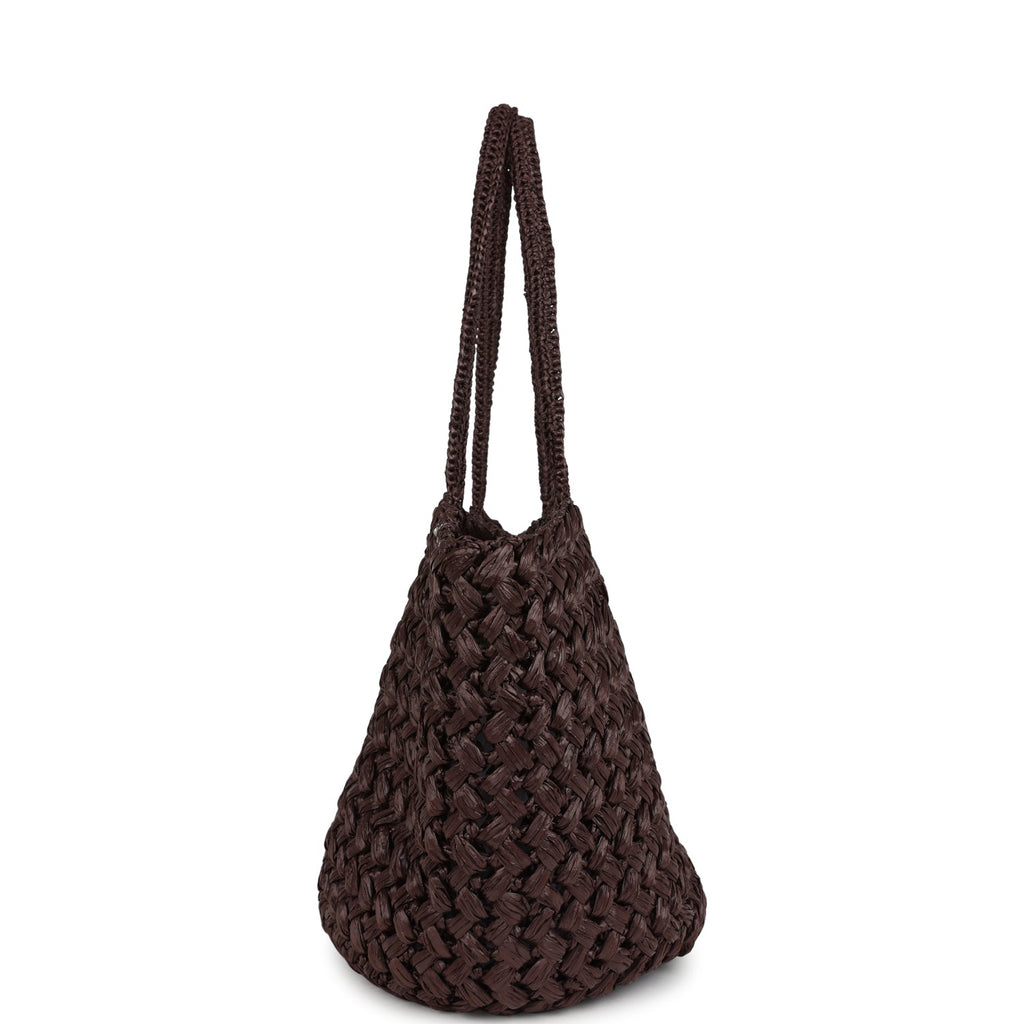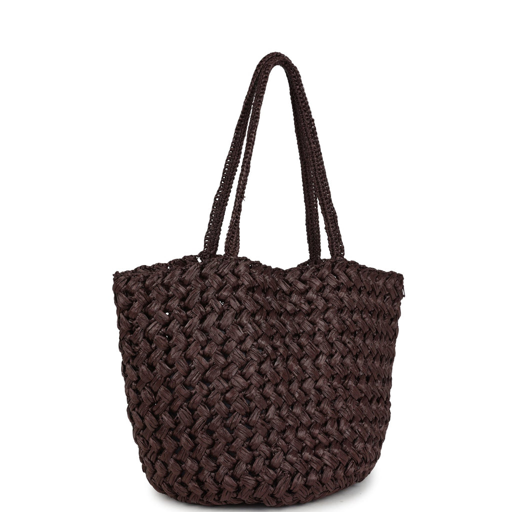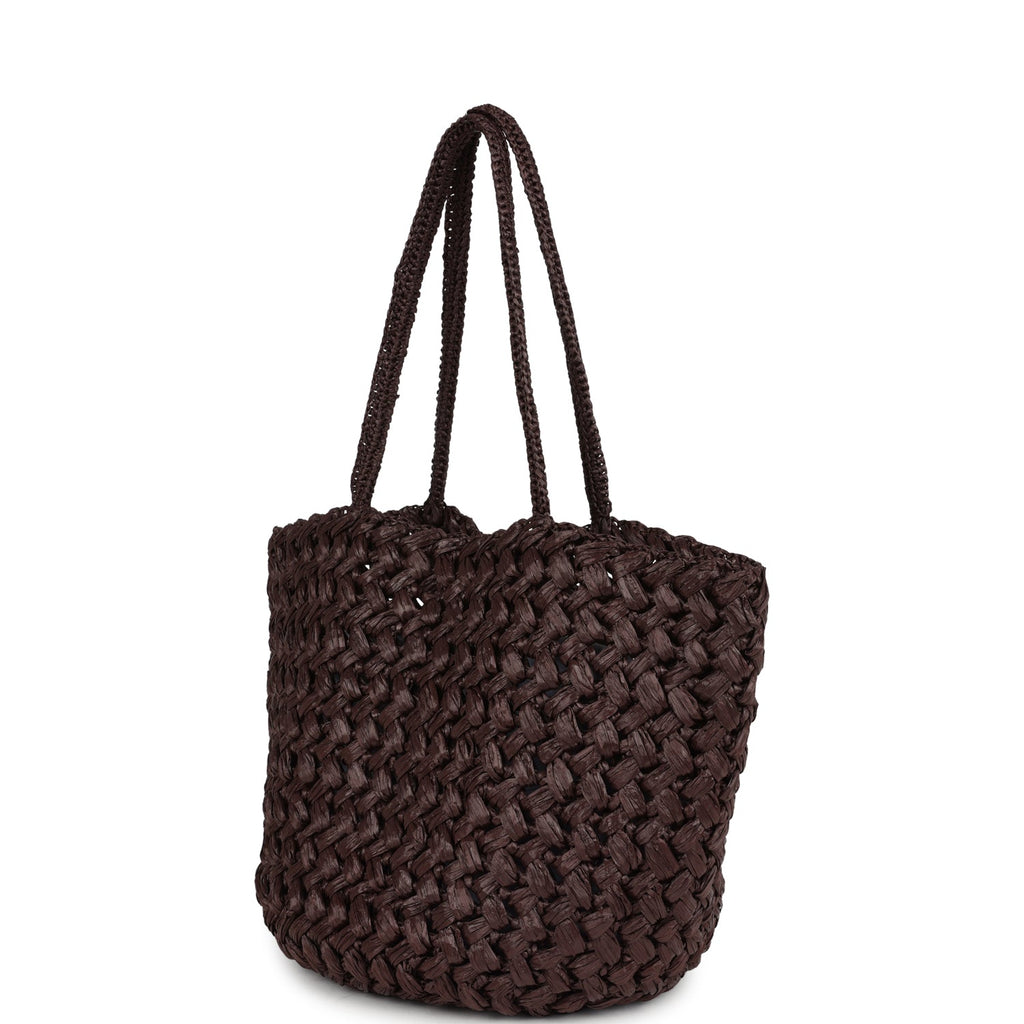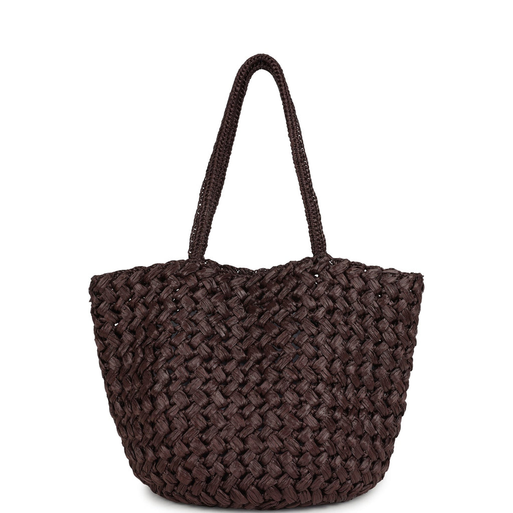 This The Row Estelle Tote Bag is in Espresso raffia featuring a handwoven tote bag in natural raffia with double woven shoulder straps and an interior leather tie closure.