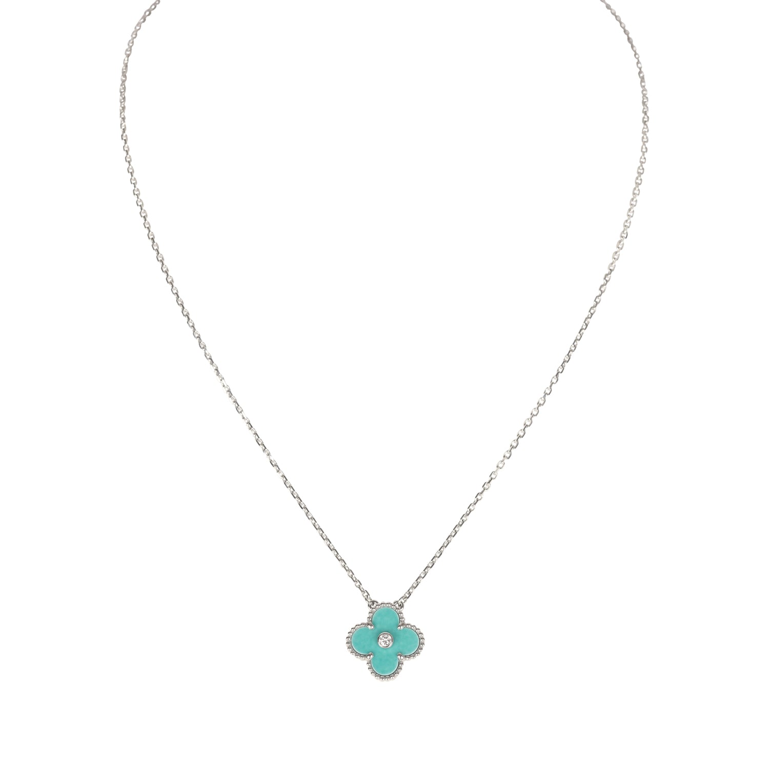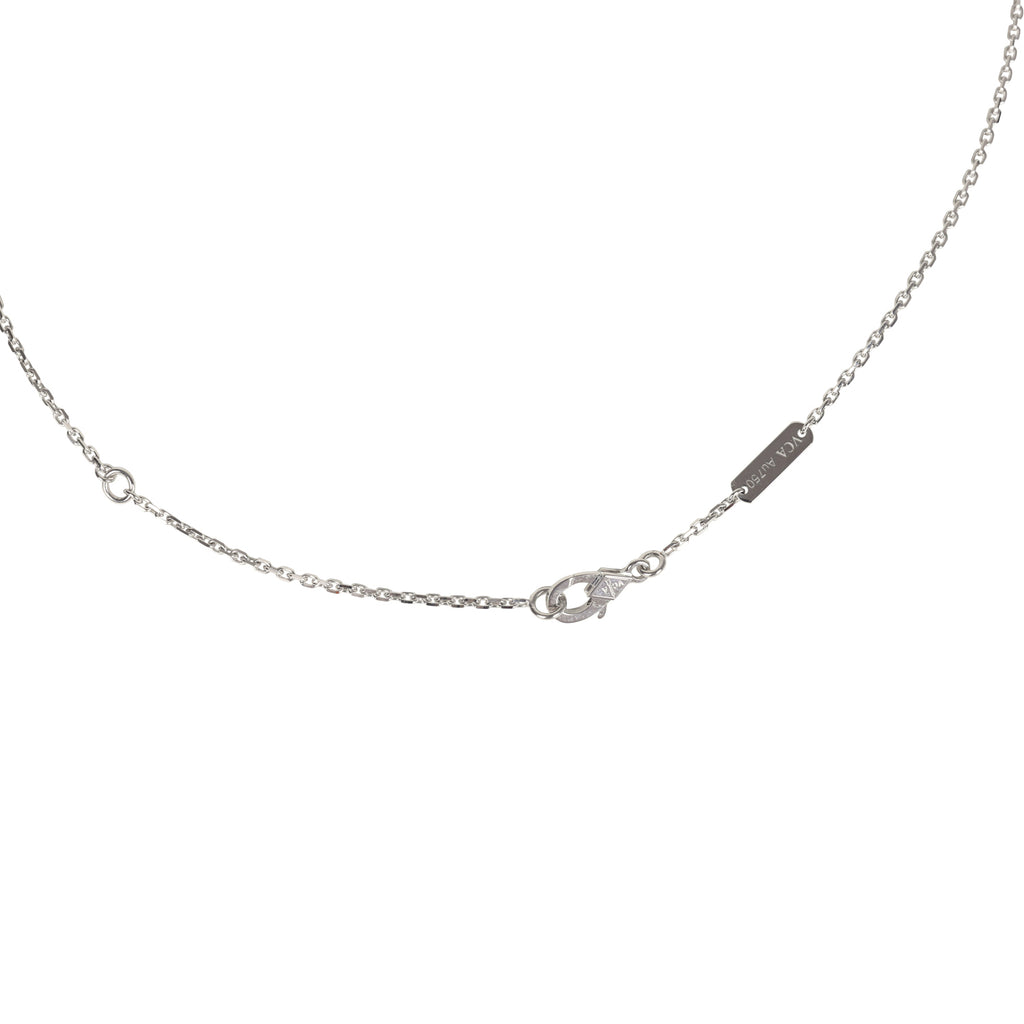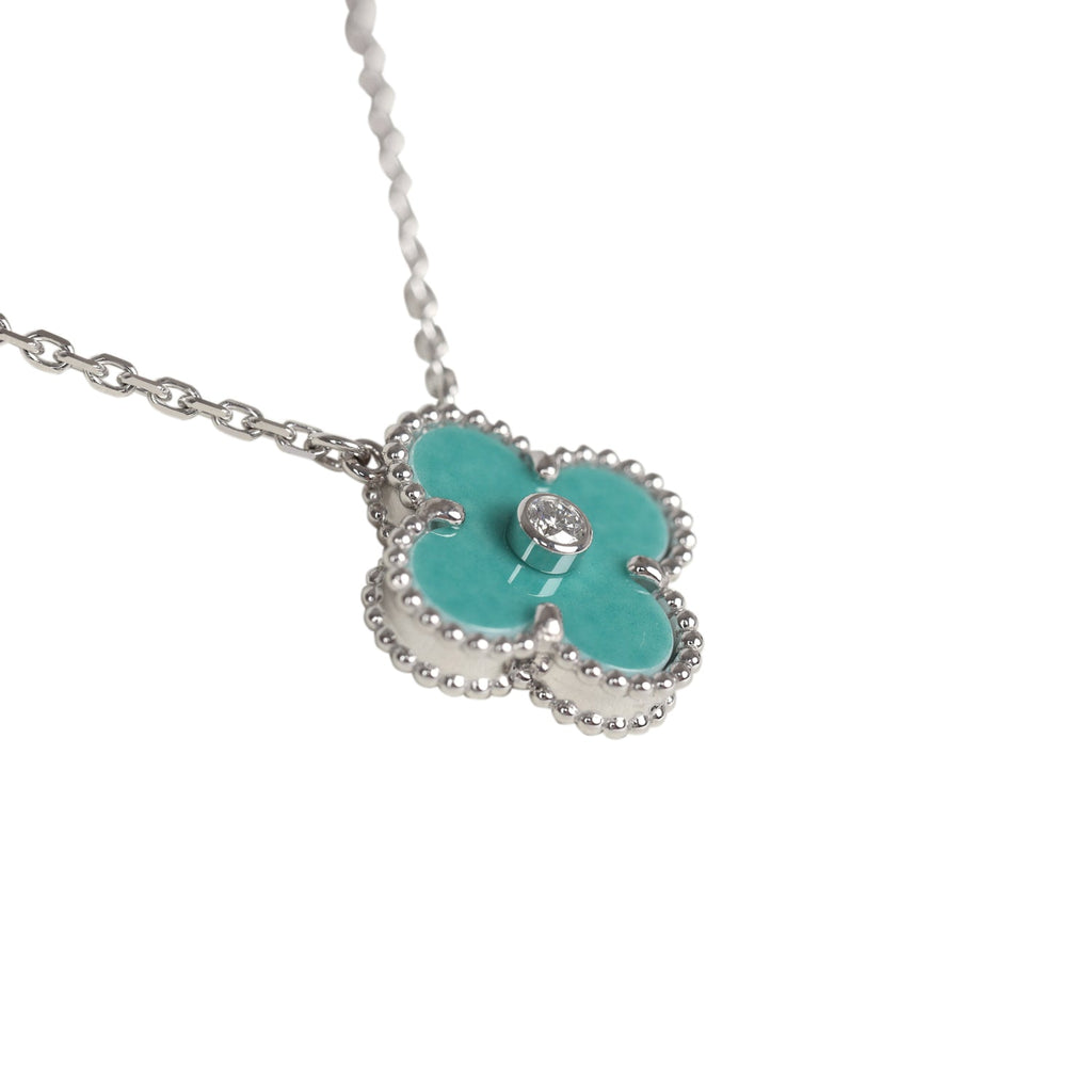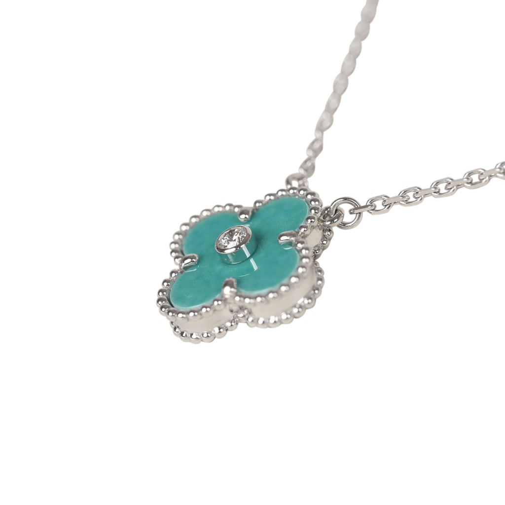 Van Cleef & Arpels 2022 Holiday Vintage Alhambra Pendant Necklace Light Green Celadon Sevres Porcelain & Diamonds White Gold Hardware