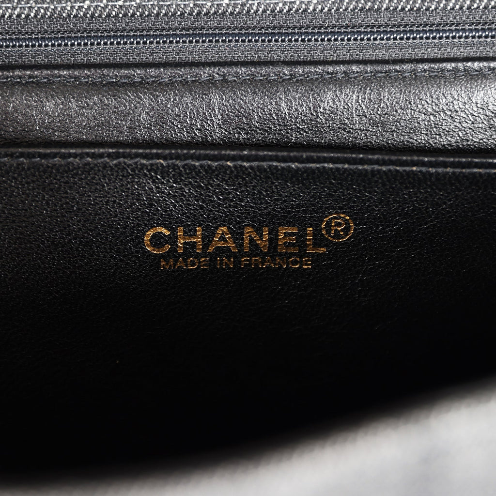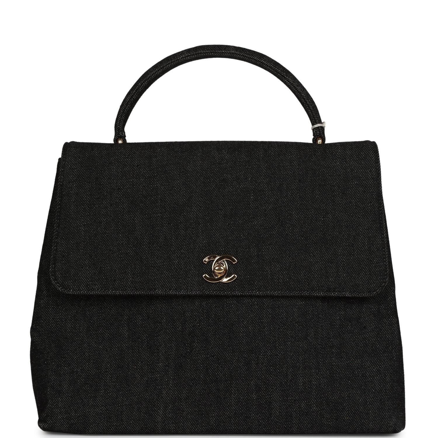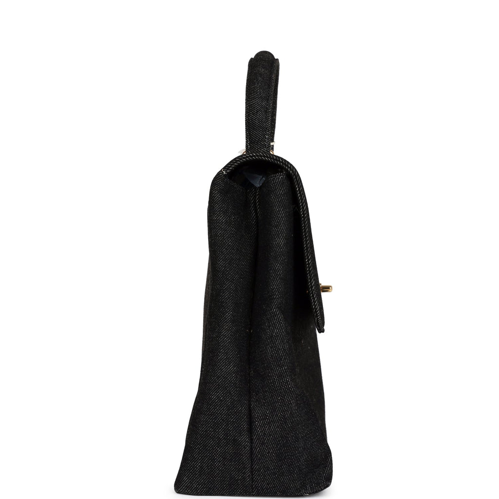 Vintage Chanel Kelly Top Handle Bag Black Denim Gold Hardware