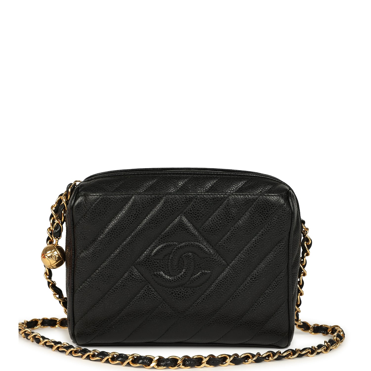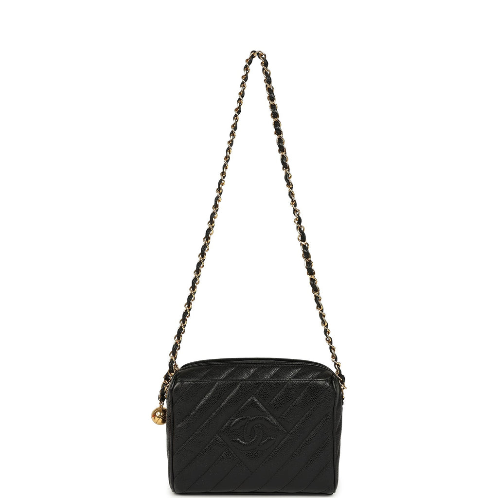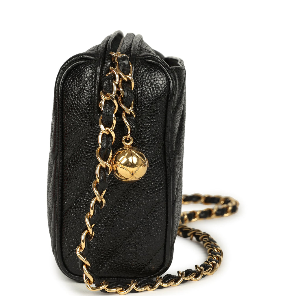 Vintage Chanel Mini Diagonal Quilted Camera Bag Black Caviar Gold Hardware