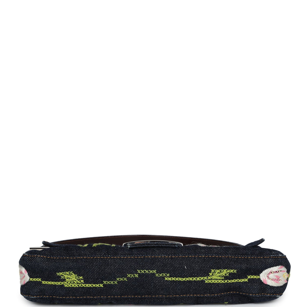 This vintage Fendi baguette bag is of embroidered blue, pink and green embroidered denim with silver hardware. This handbag is crafted of blue denim with white flowers embroidered into the bag with pink and green detailing and features a front flap snap closure, and an adjustable denim shoulder strap.
