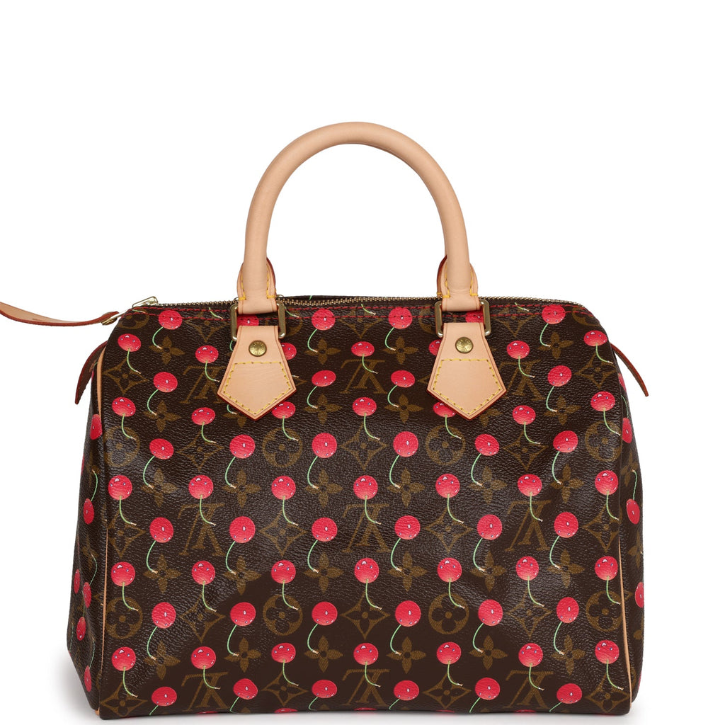 This LV x Murakami Cherry Cerises Speedy 25 is in monogram canvas with brass hardware and features contrast stitching, smiling cherry faces, zip top closure and beige vachetta leather trim and top handles.